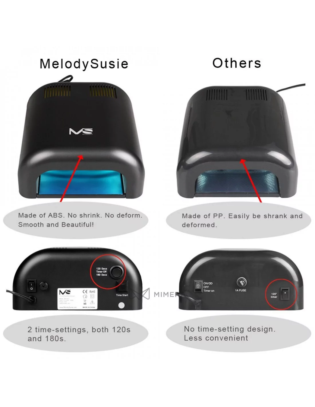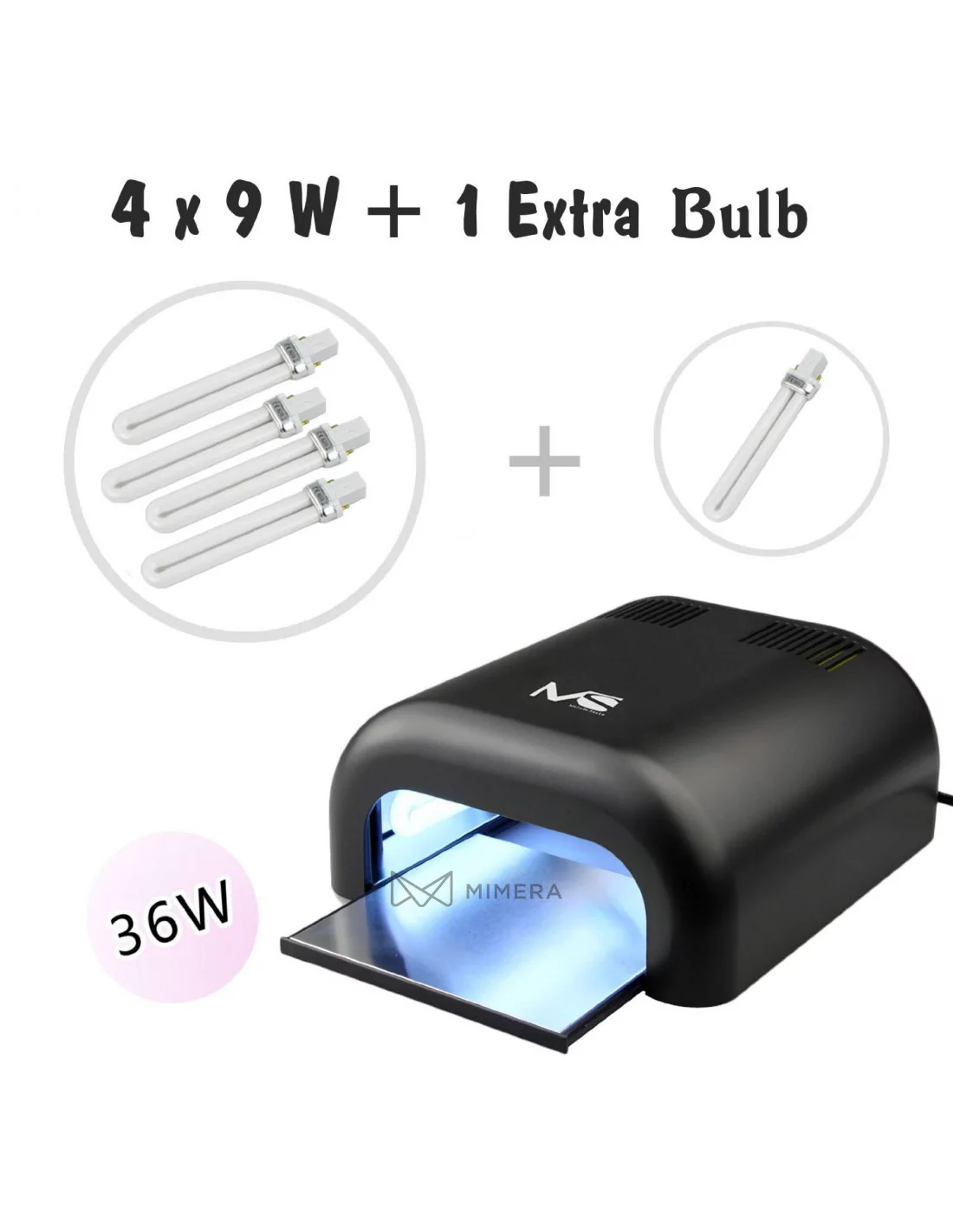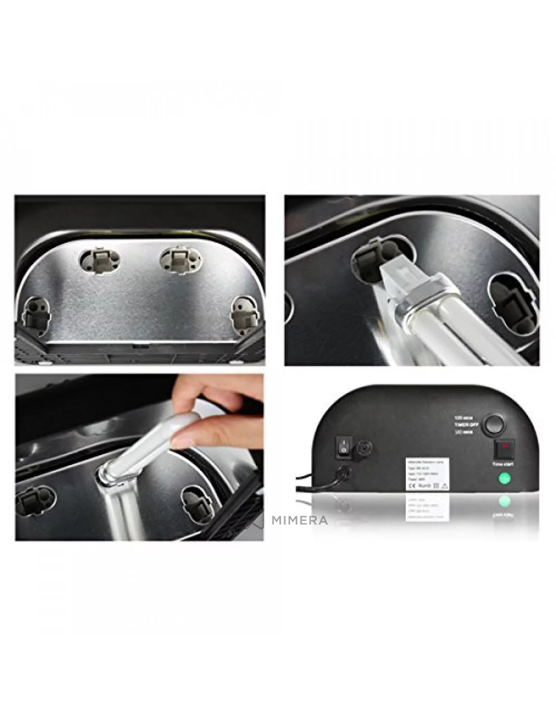 Tento profesionální 36W UV přístroj má zabudované čtyři 9W UV žárovky a disponuje také náhradní žárovkou na výměnu. Integrovaný časovač se automaticky vypne podle potřeby po 120 nebo 180 sekundách, což umožňuje mimořádně efektivní práci. Vysoký světelný výkon PL UVA zajišťuje mimořádně rychlé a šetrné sušení; výsledkem pak je perfektní vzhled jako v salónu.