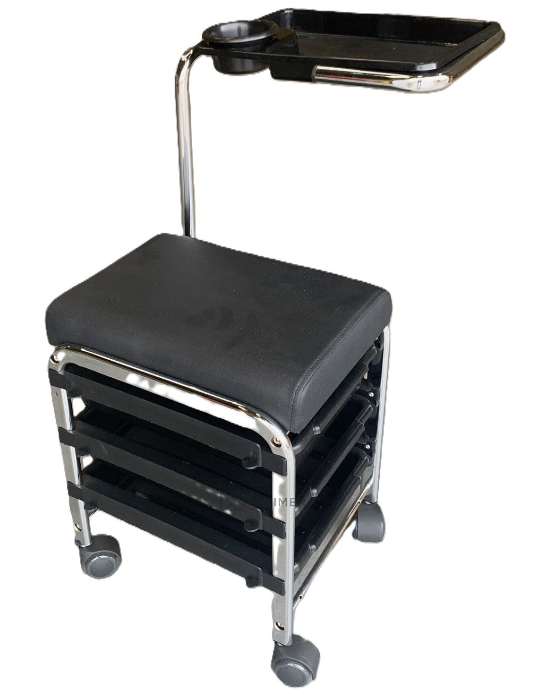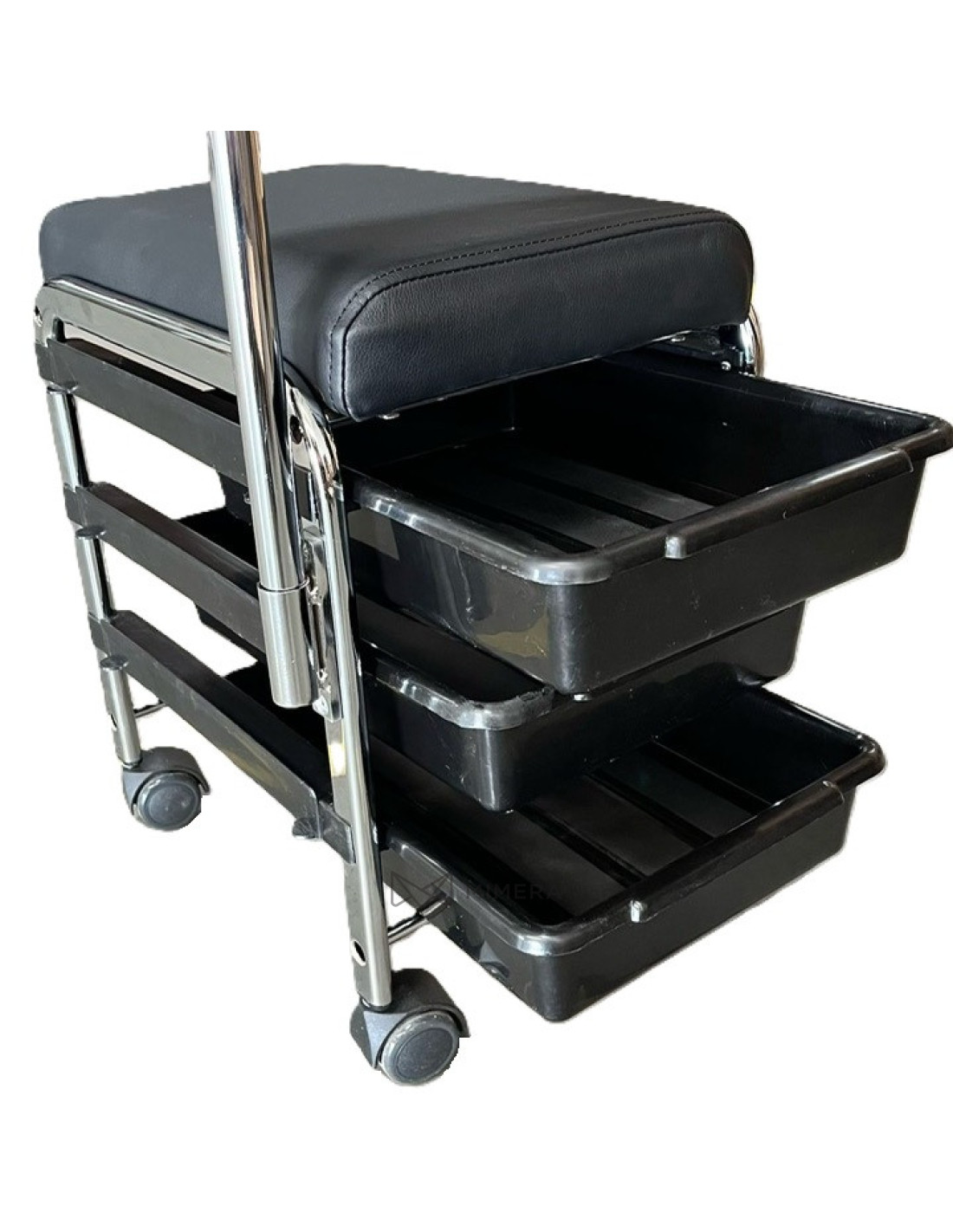 Kadeřnický vozík/taburet SKIP je šikovný pomocník do kadeřnického salonu, který spojuje pohodlné sezení na přestávky s praktickým úložným prostorem. Pod měkce čalouněným sedákem se nacházejí tři výsuvné zásuvky pro uložení nástrojů a pomůcek. Výklopné otočné rameno s táckem a miskou na barvu usnadňuje práci při míchání nebo odkládání náčiní. Ideální doplněk pro organizovaný a efektivní salon.