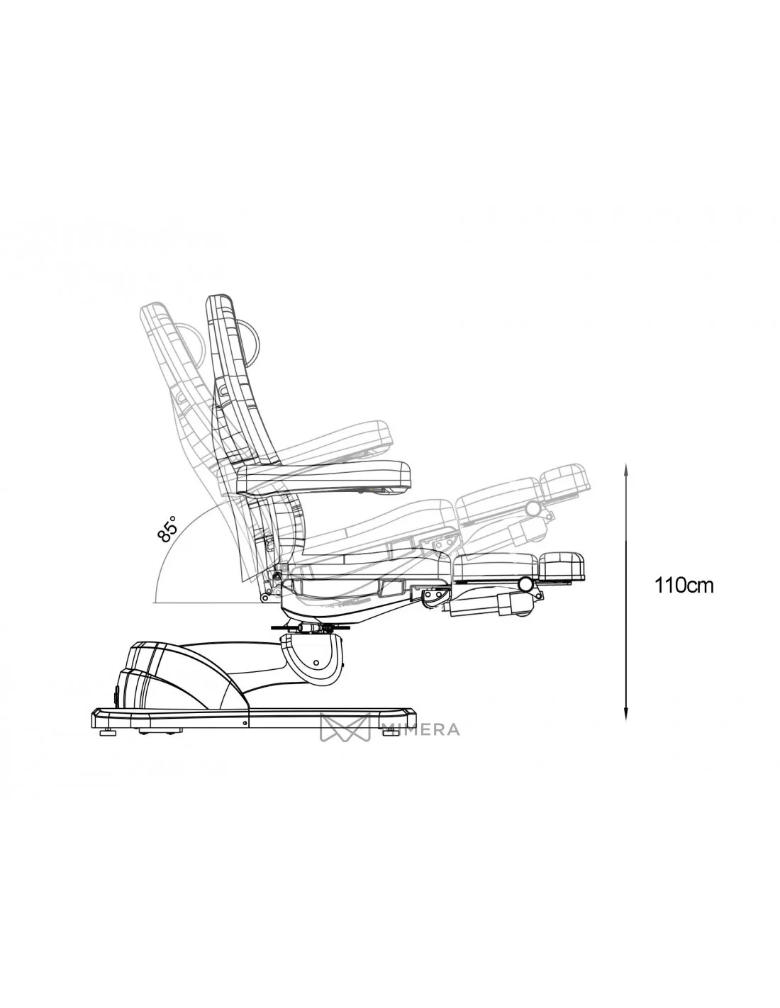 Štýlovové a velmi flexibilní otočné pedikérské křeslo s 5 motory pro nastavení výšky, opěrky a sklonu sedáku a sklonu nožních částí, které se nastavují pomocí ručního ovladače (tento je součástí balení). K lehátku je také možné doobjednat pedálový ovladač. Křeslo je otočné do stran o (- 60 ° ~ + 60 °). Nožní části jsou otočné do stran o 90 °, vertikálně se nastavují plynule pneumatickou páčkou a navíc jsou prodlužuje.