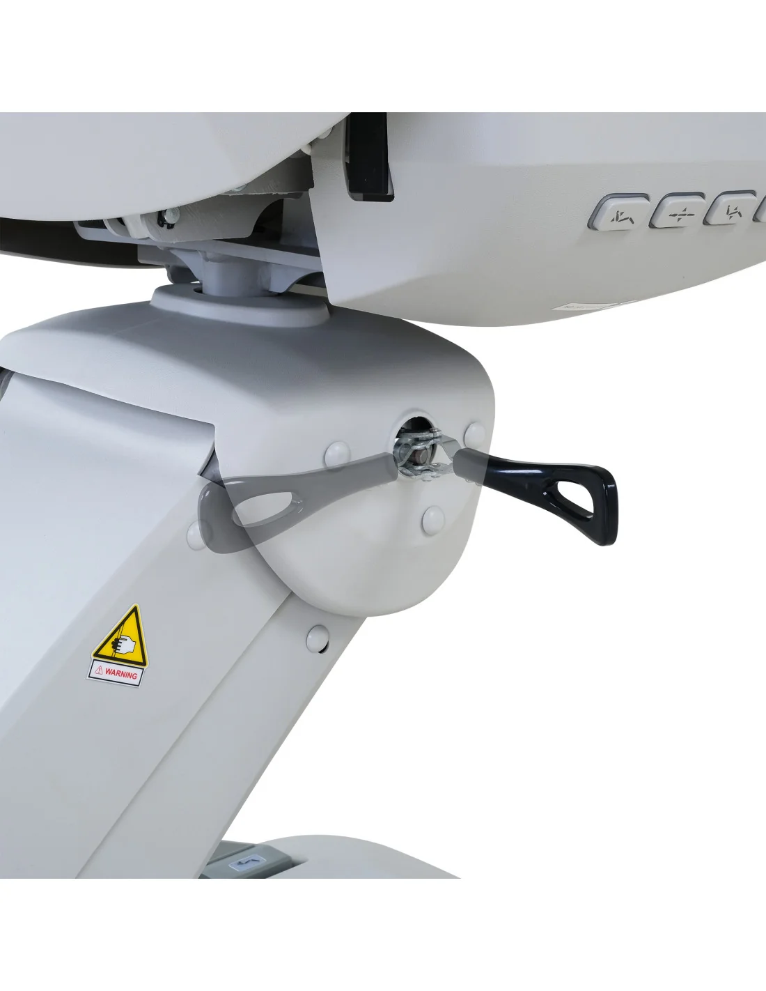 Weitere wichtige Vorteile dieser Liege sind die niedrige Mindesthöhe und die Möglichkeit, die Liege in beide Richtungen in einem Winkel (~120° bis +120°) zu drehen, was eine bequeme Anpassung auch für kleinere oder ältere Kunden ermöglicht. RAMON DELUX PLUS E4 ist mit vier Motoren ausgestattet, die es ermöglichen, die Höhe der Liege, die Neigung der Rückenlehne, die Neigung des Sitzes (Wiege) und das Beinteil zu verstellen. Das Besondere daran ist, dass er auf verschiedene Arten positioniert werden kann, je nachdem, was Ihnen im Moment besser passt - durch in die Rückenlehne und den Sitz eingebaute Tasten, durch ein in die Basis integriertes Pedalsystem oder durch eine Handsteuerung, die im Paket enthalten ist.