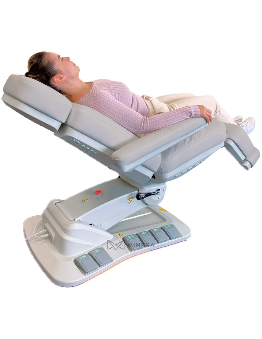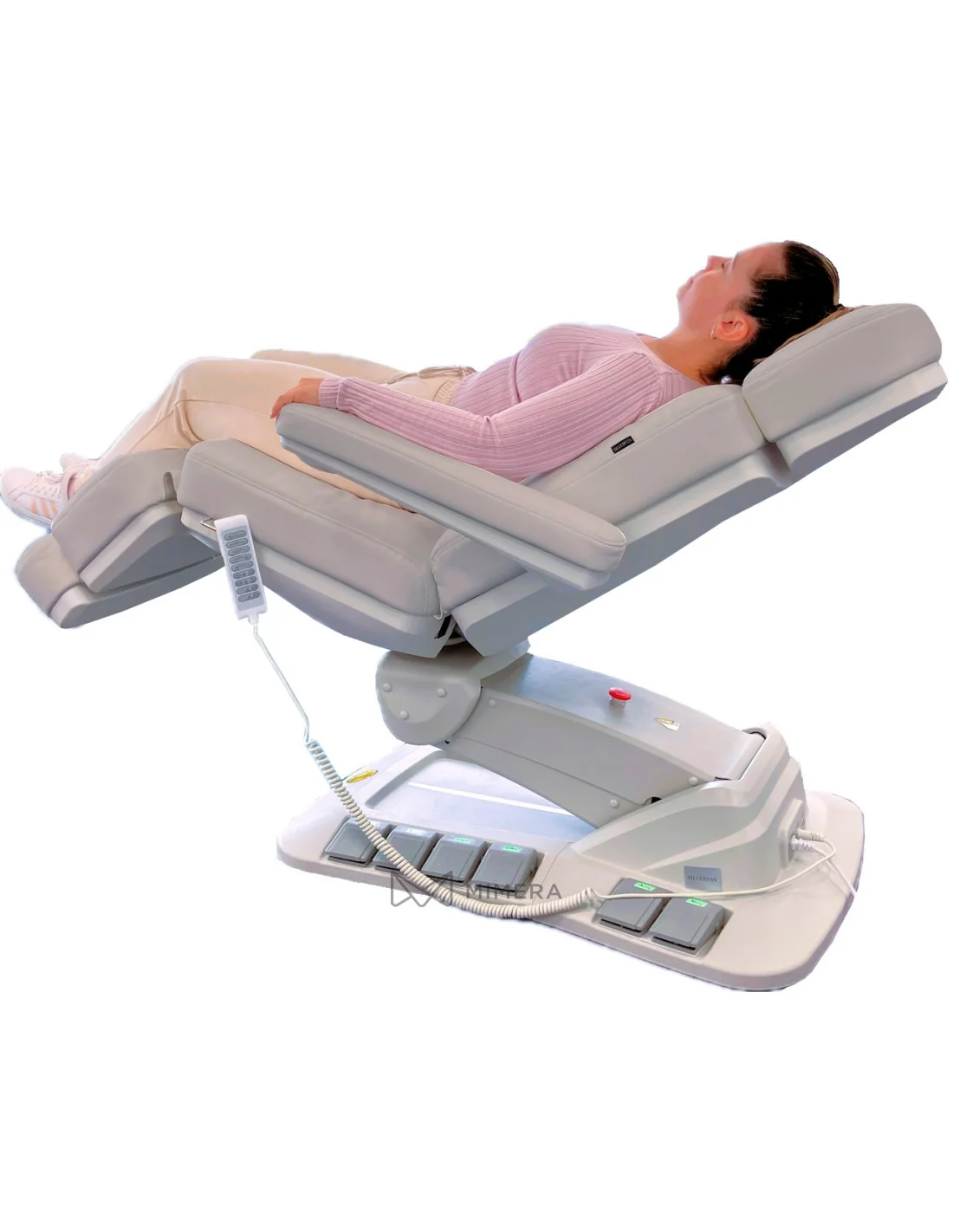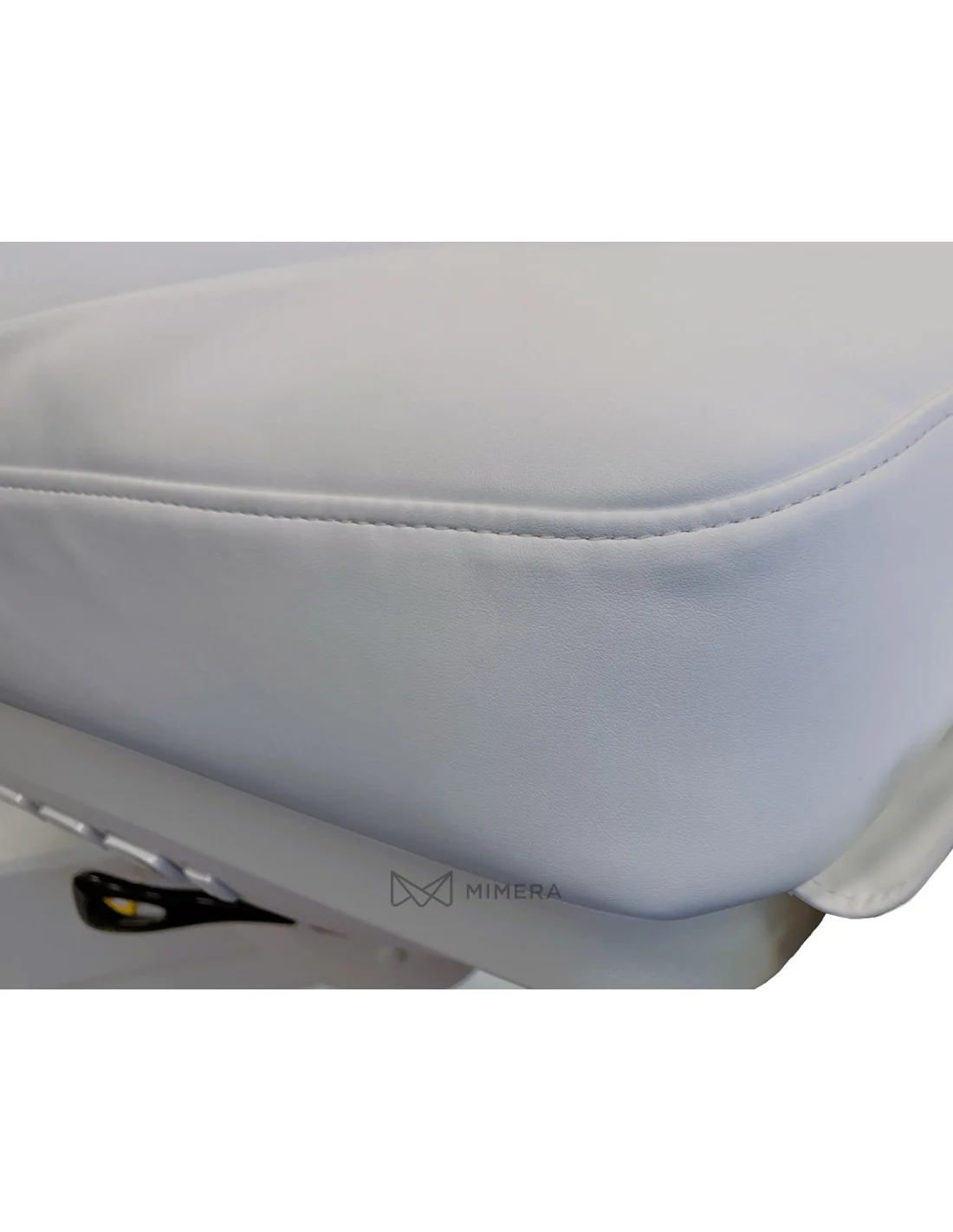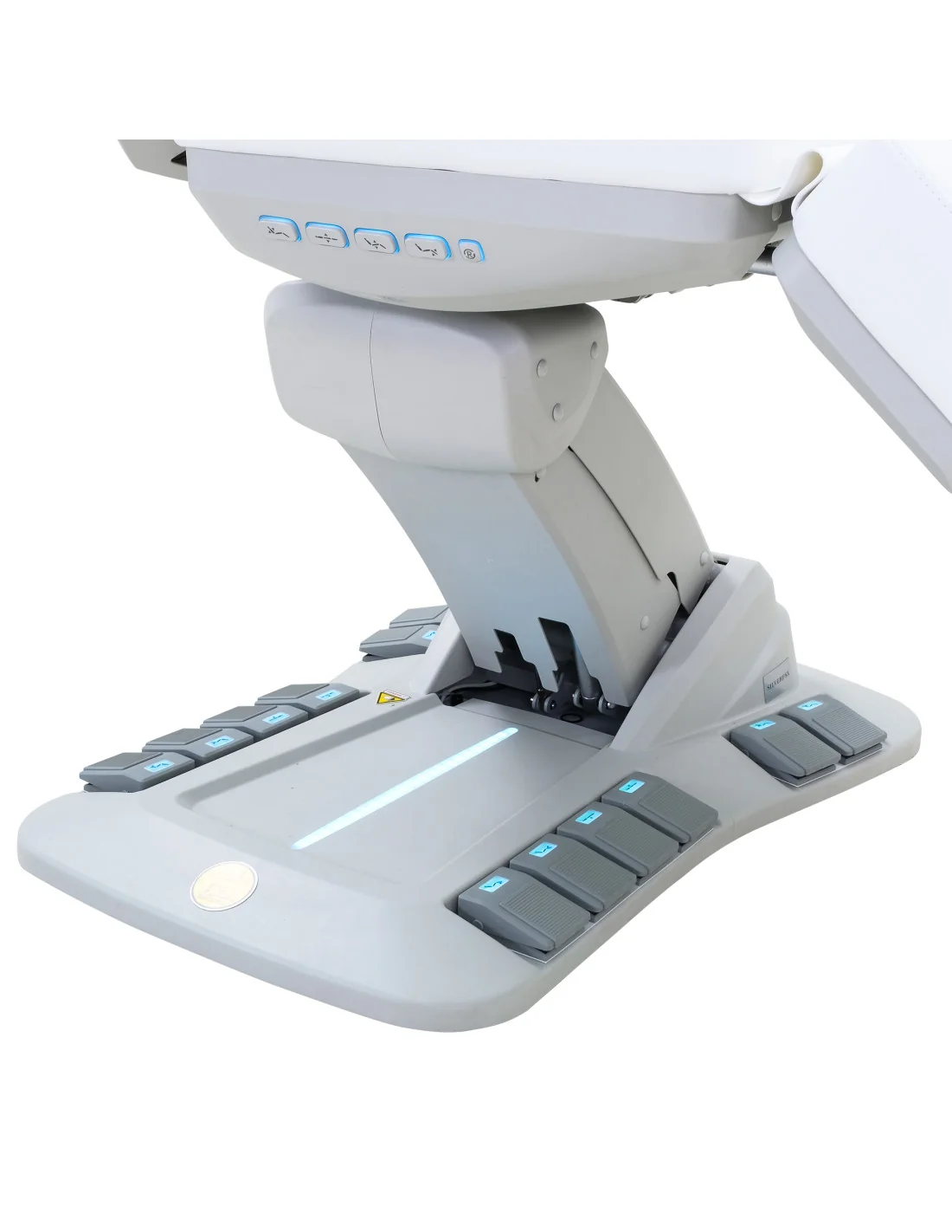 Sie ist mit einer extra weichen, mehrlagigen Polsterung aus PU-Mikroleder und einem glatten Muster (Microgoove) ausgestattet, das Ihren Kunden ein Lächeln ins Gesicht zaubern wird. Deren Komfort wird durch die eingebaute Heizfunktion unterstützt, die jede Behandlung auch an kalten Tagen angenehmer macht. Zur Zufriedenheit Ihrer Kunden wird auch die LED-Beleuchtung mit wechselnden Farben beitragen, die die Tasten, die Pedale und sogar die Basis der Liege beleuchtet.