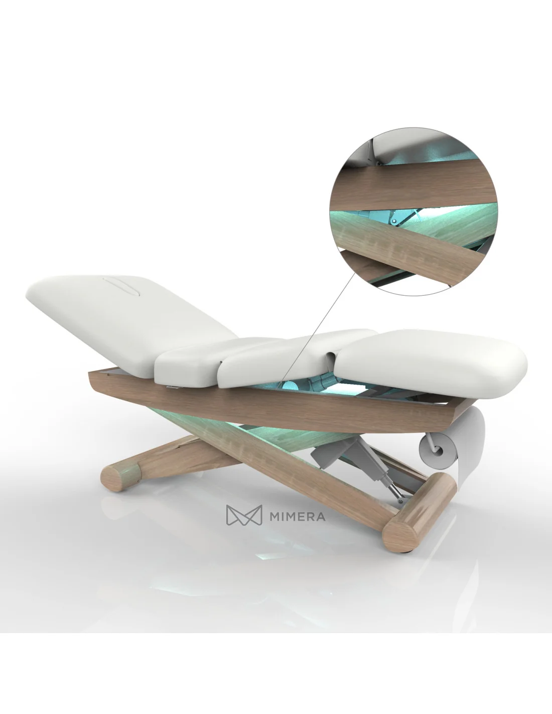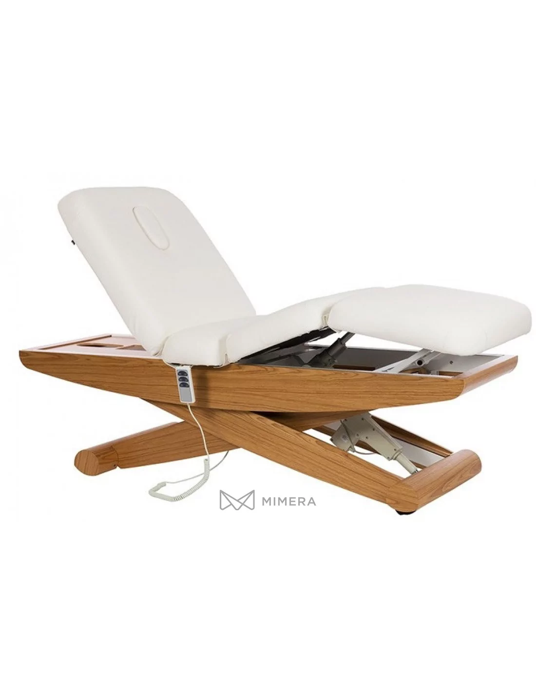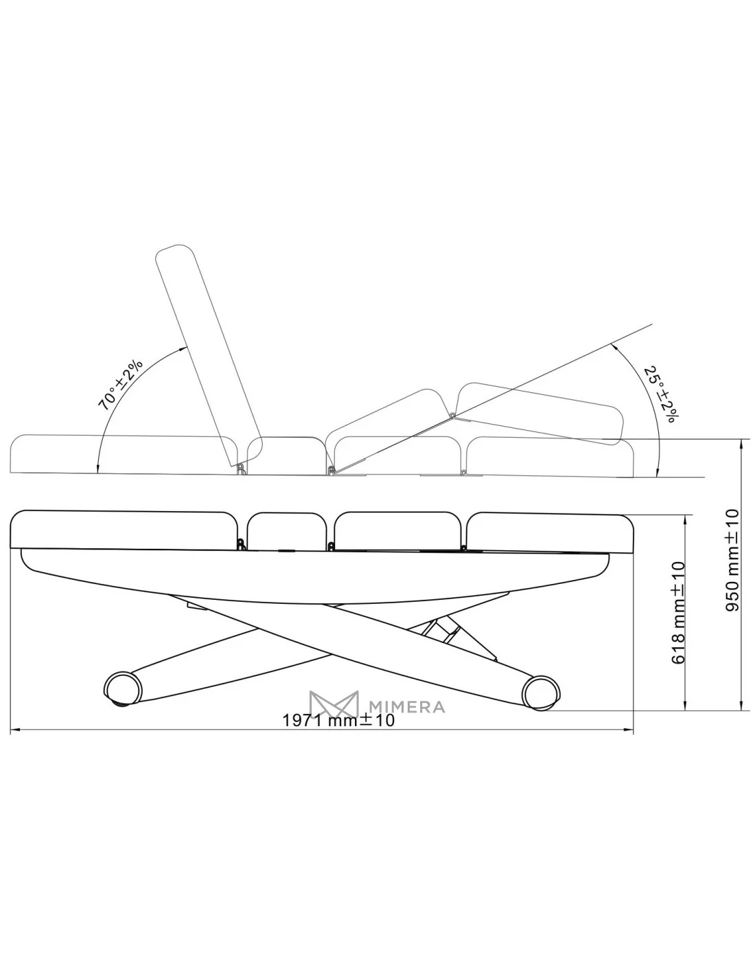 Die Liege hat eine scherenförmige Metallstruktur mit natürlicher Holzveredelung, die dem Raum eine sehr beeindruckende Wirkung verleiht. Die bequeme PU-Polsterung von höchster Qualität ermöglicht eine einfache Pflege und Wartung. Die Liege hat außerdem einen Gesichtsausschnitt.