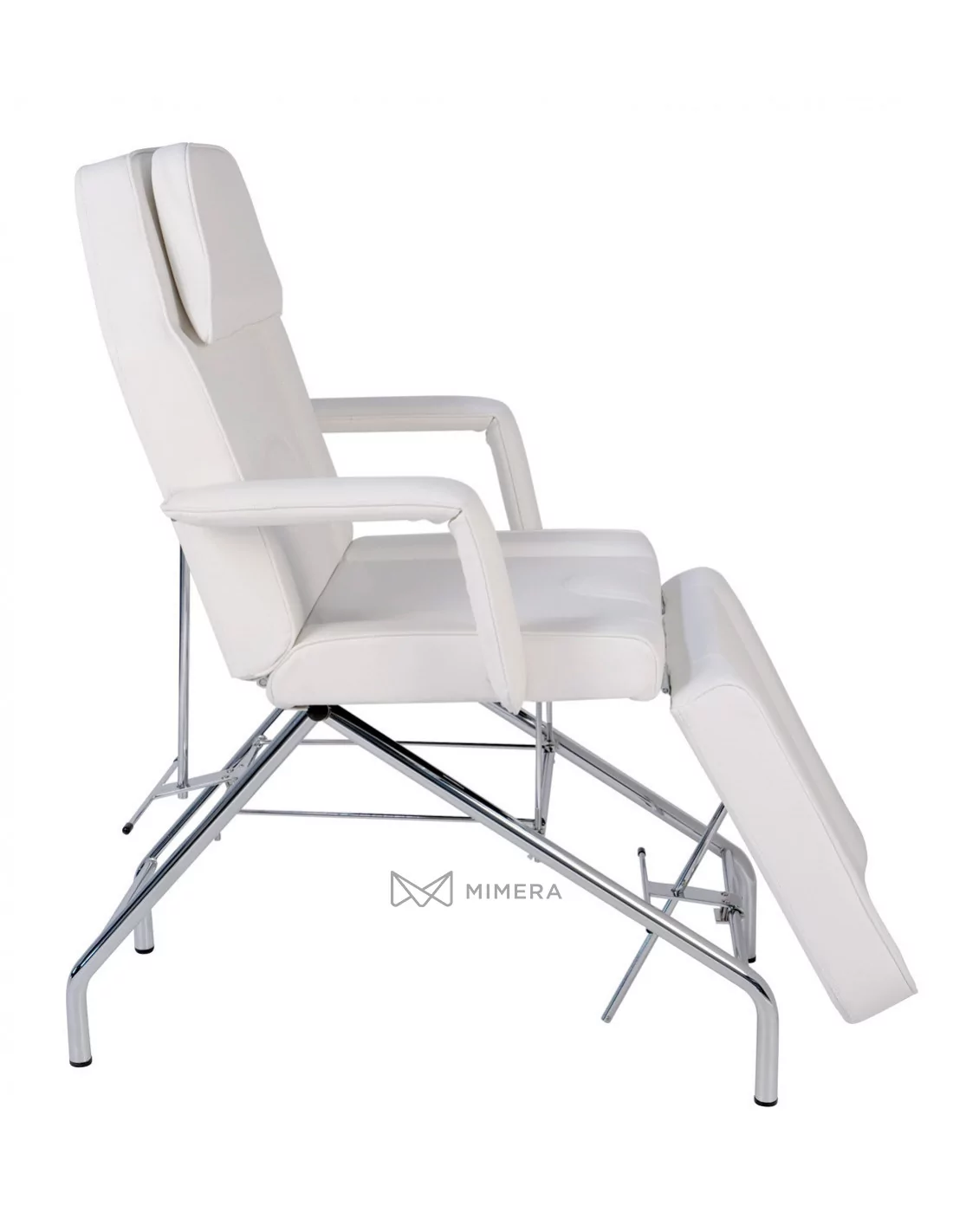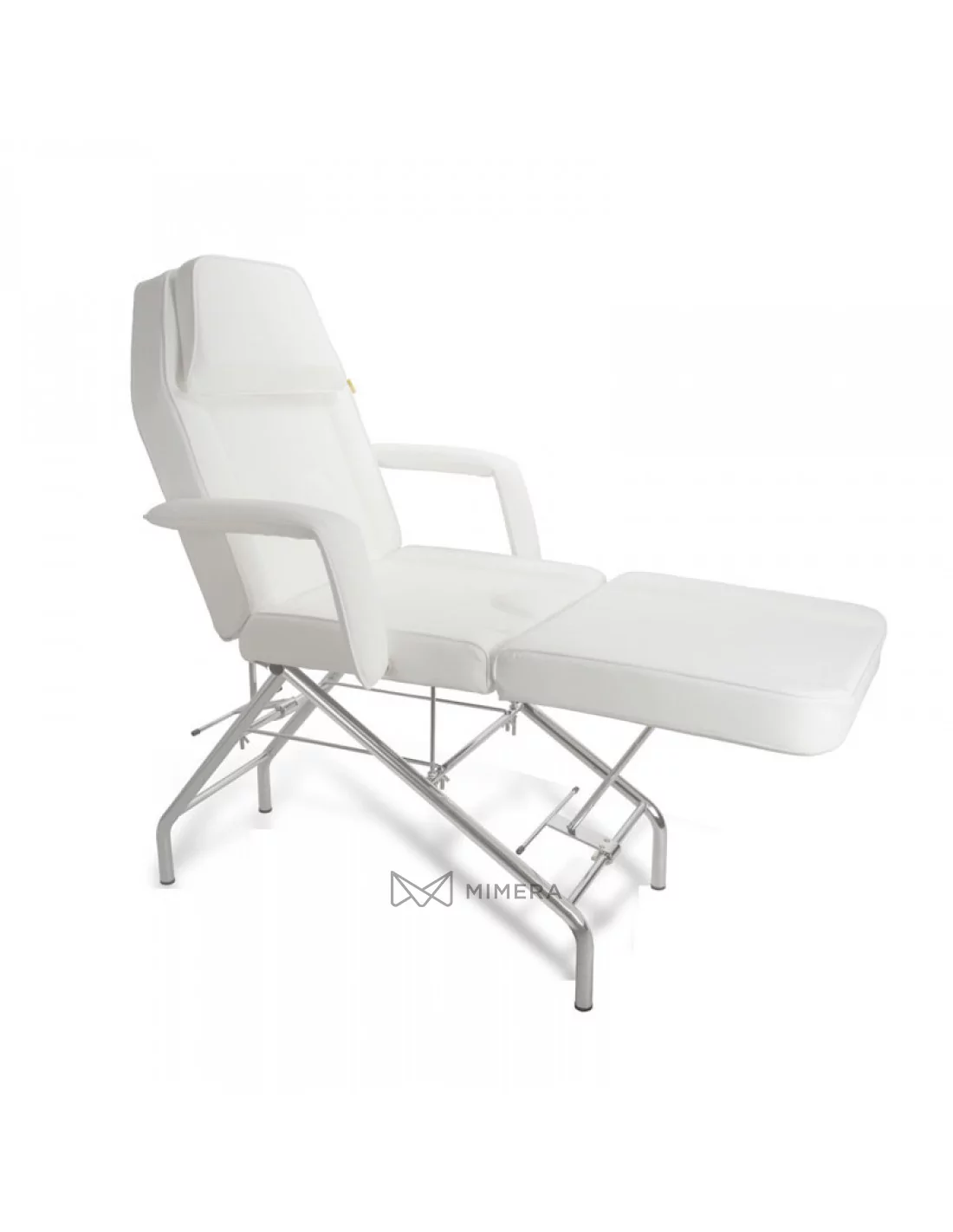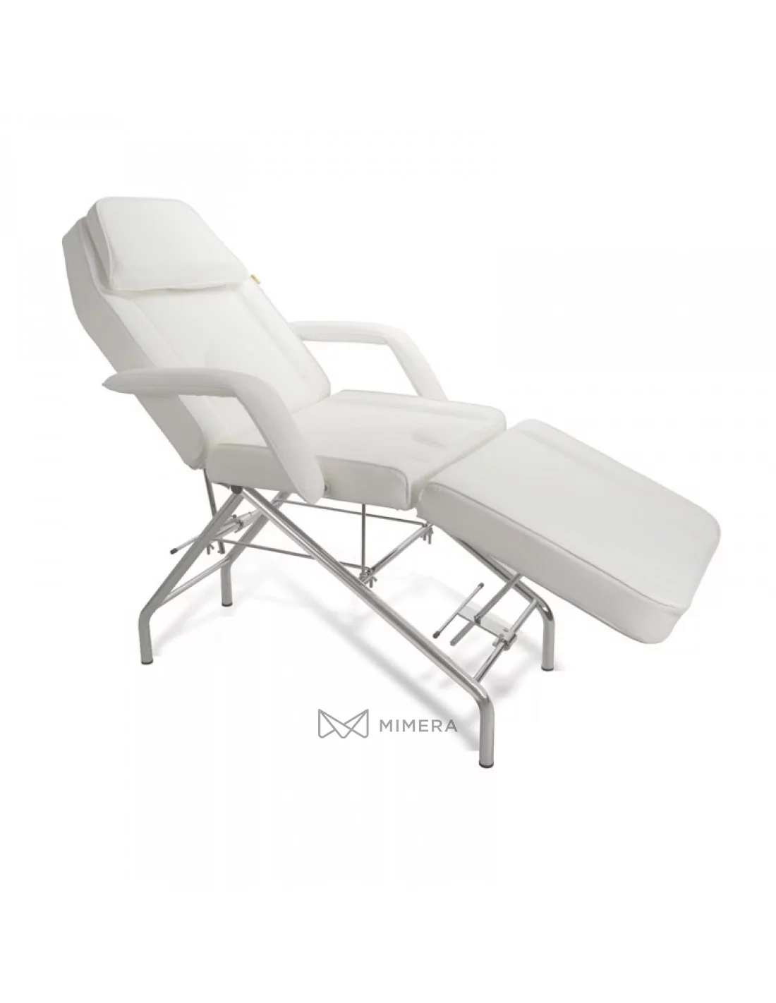 This model is particularly minimalistic with its simple, modern design. This bed is suitable for cosmetic and body treatments, as well as in the massage and wellness area. The back part and the foot part are manually adjustable up to 45 ° each and are easy to operate. The 11cm wide arms are removable and when moving they are shaping to the position of the chair. The chair has a cut for the face. Also included is a pillow that is attached in the opening for the face. Padding is made of high-quality PU, which is durable and easy to clean.