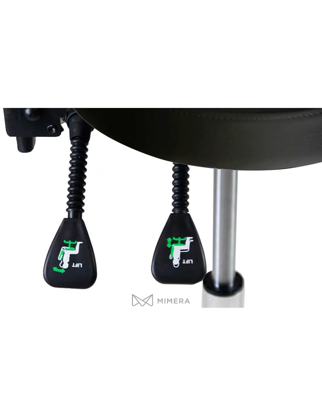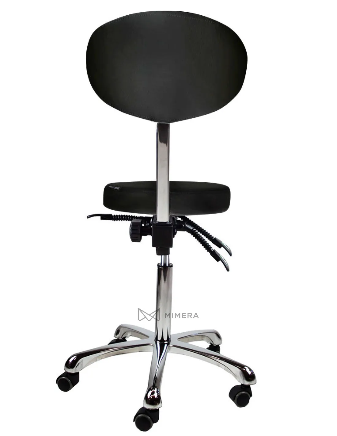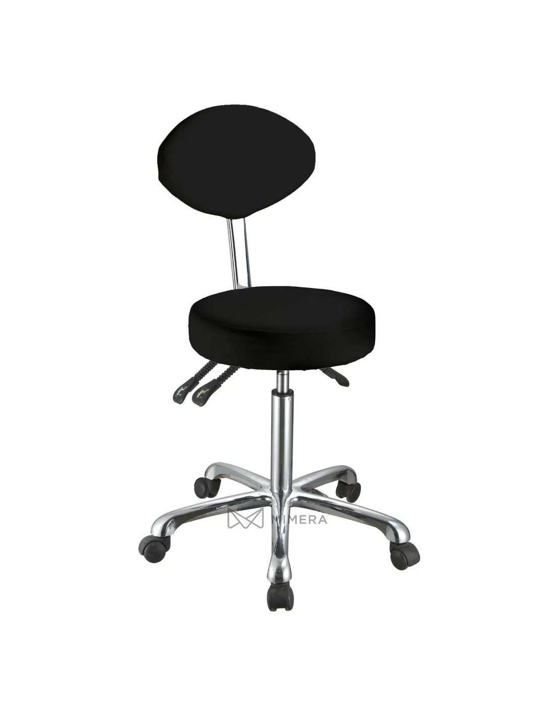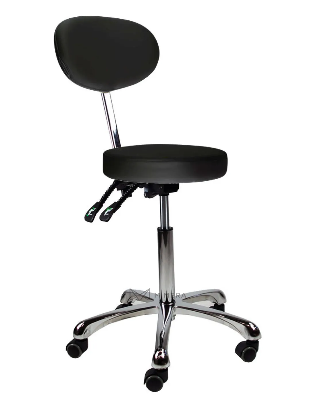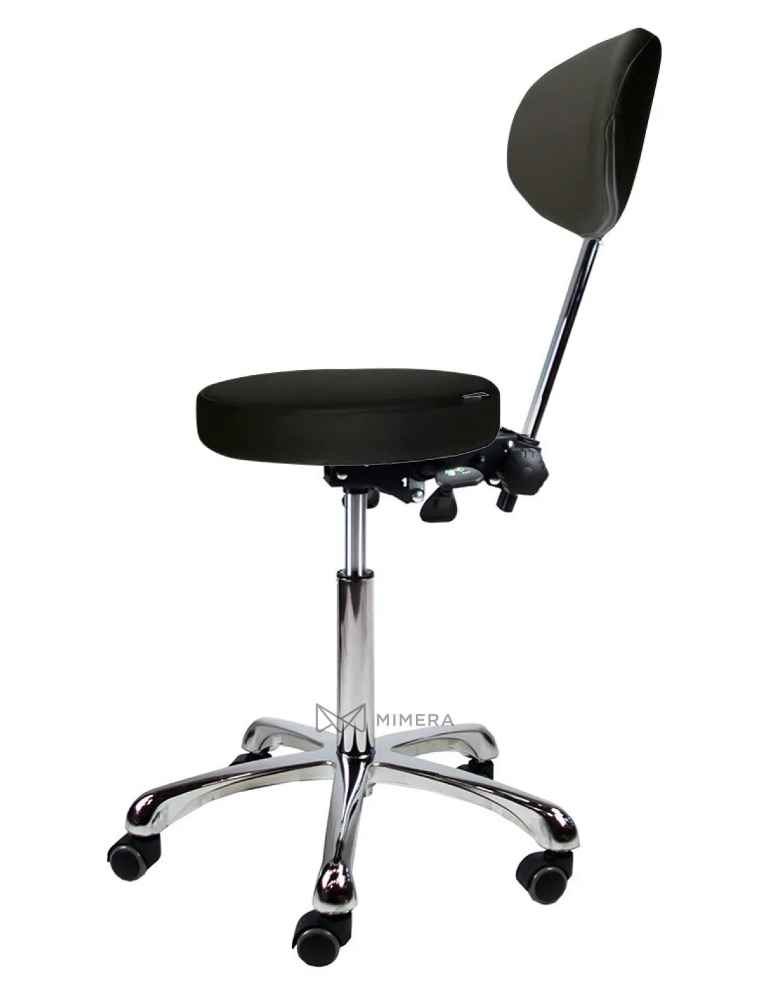 Height, seat and backrest inclination can be infinitely adjusted with three hand levers under the seat. The high-quality PU upholstery is easy to clean and the chrome-plated base is equipped with five castors for a comfortable working position.