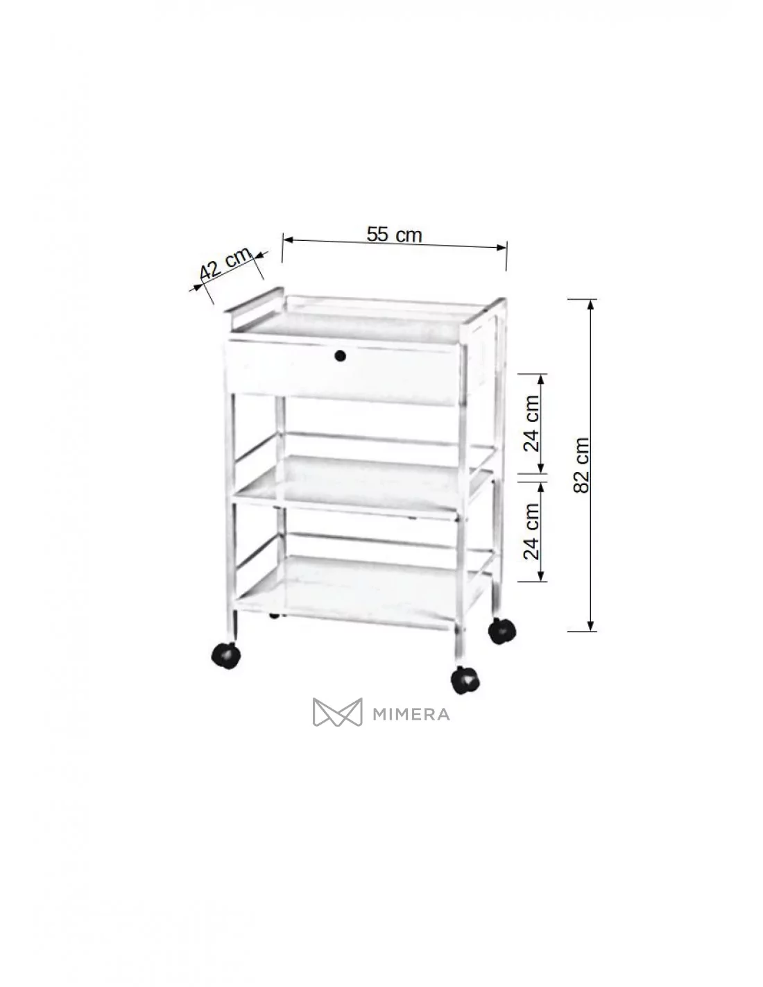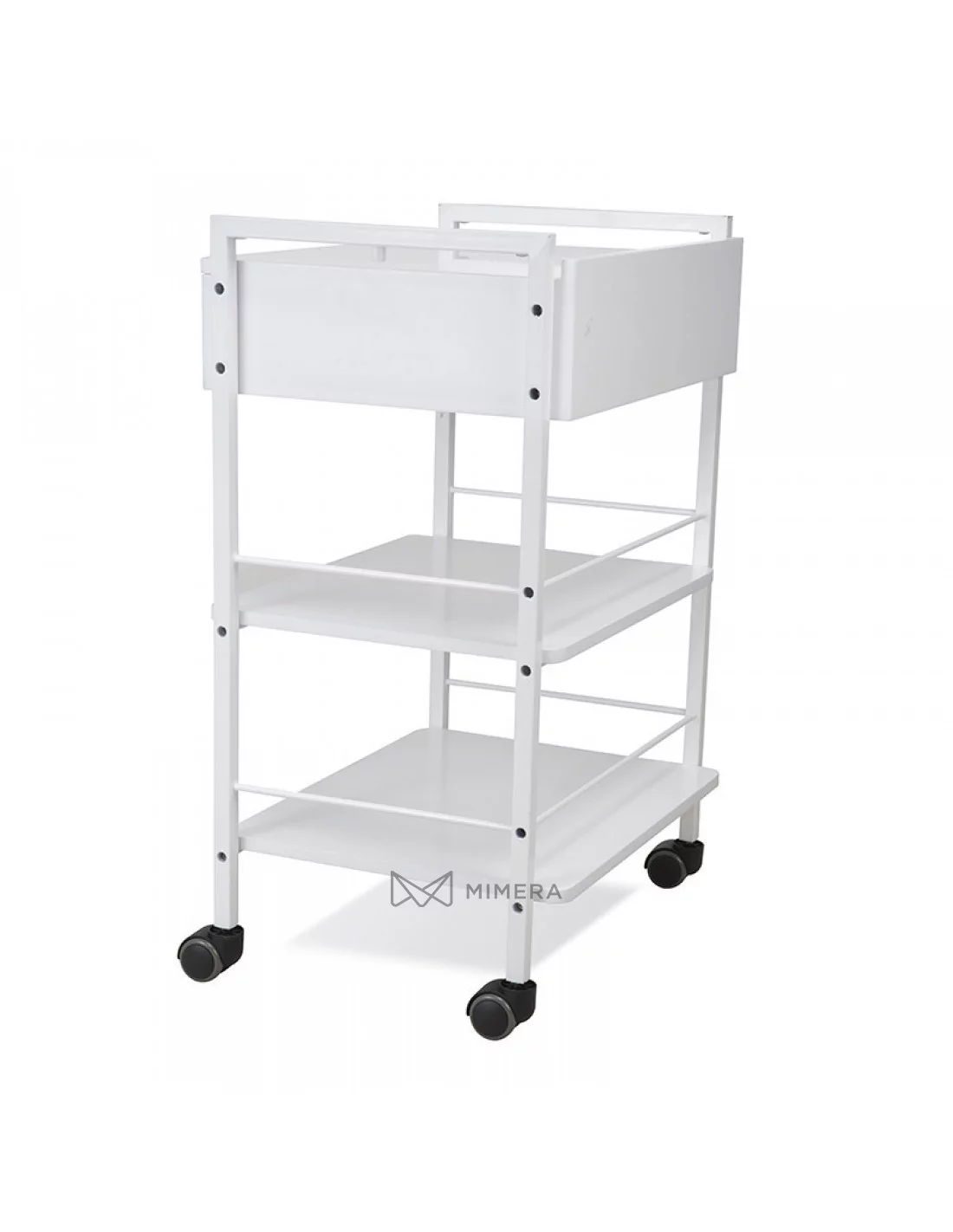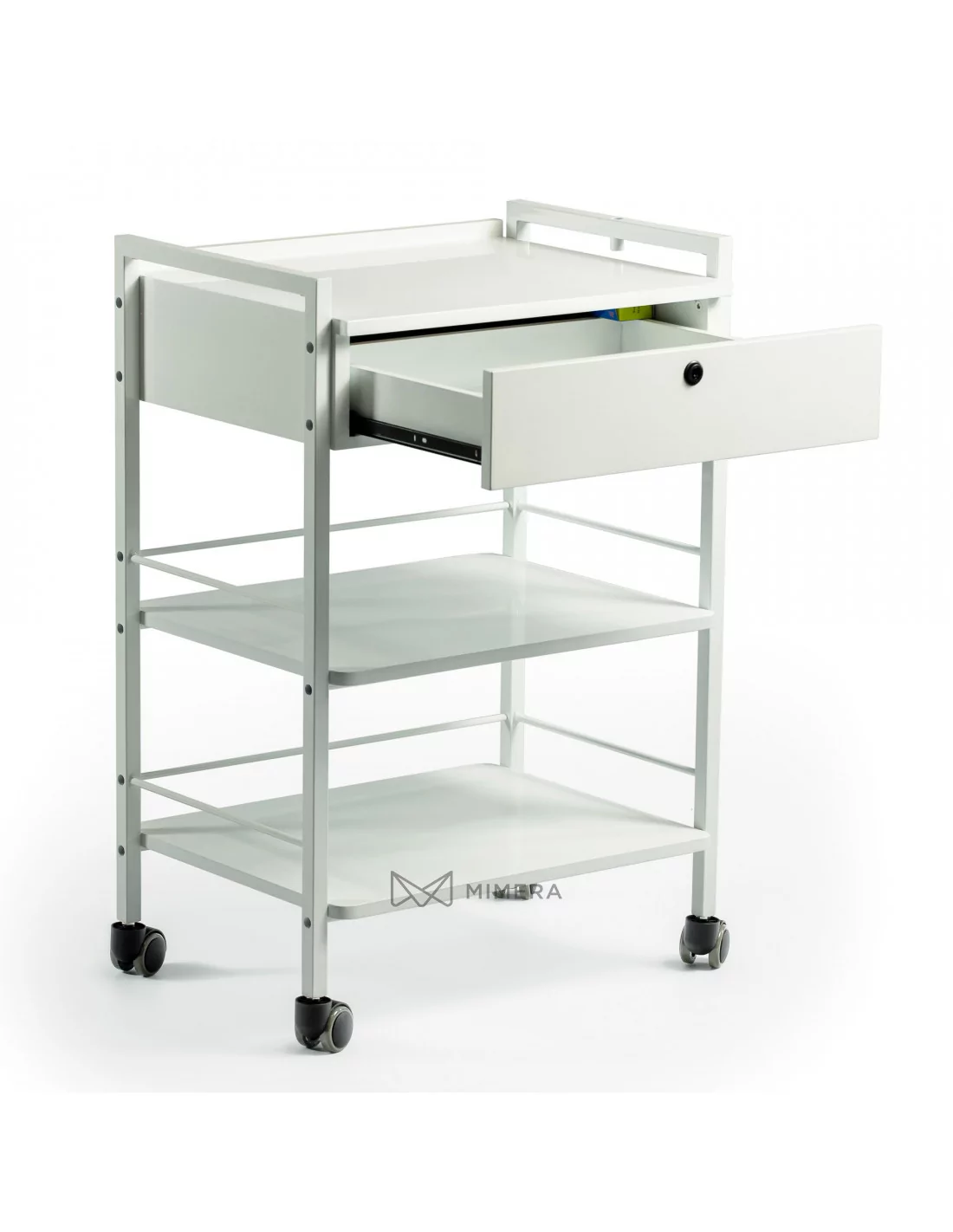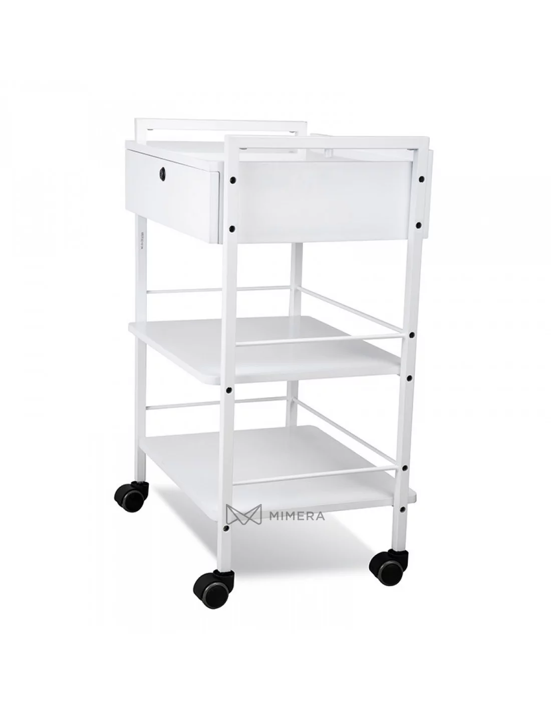 Practical, modern solution for storing and placing your work equipment. This cosmetic trolley is equipped with an additional drawer in addition to three shelves. The lockable drawer can also be used as a shelf. This allows you to store regularly used work aids at hand.