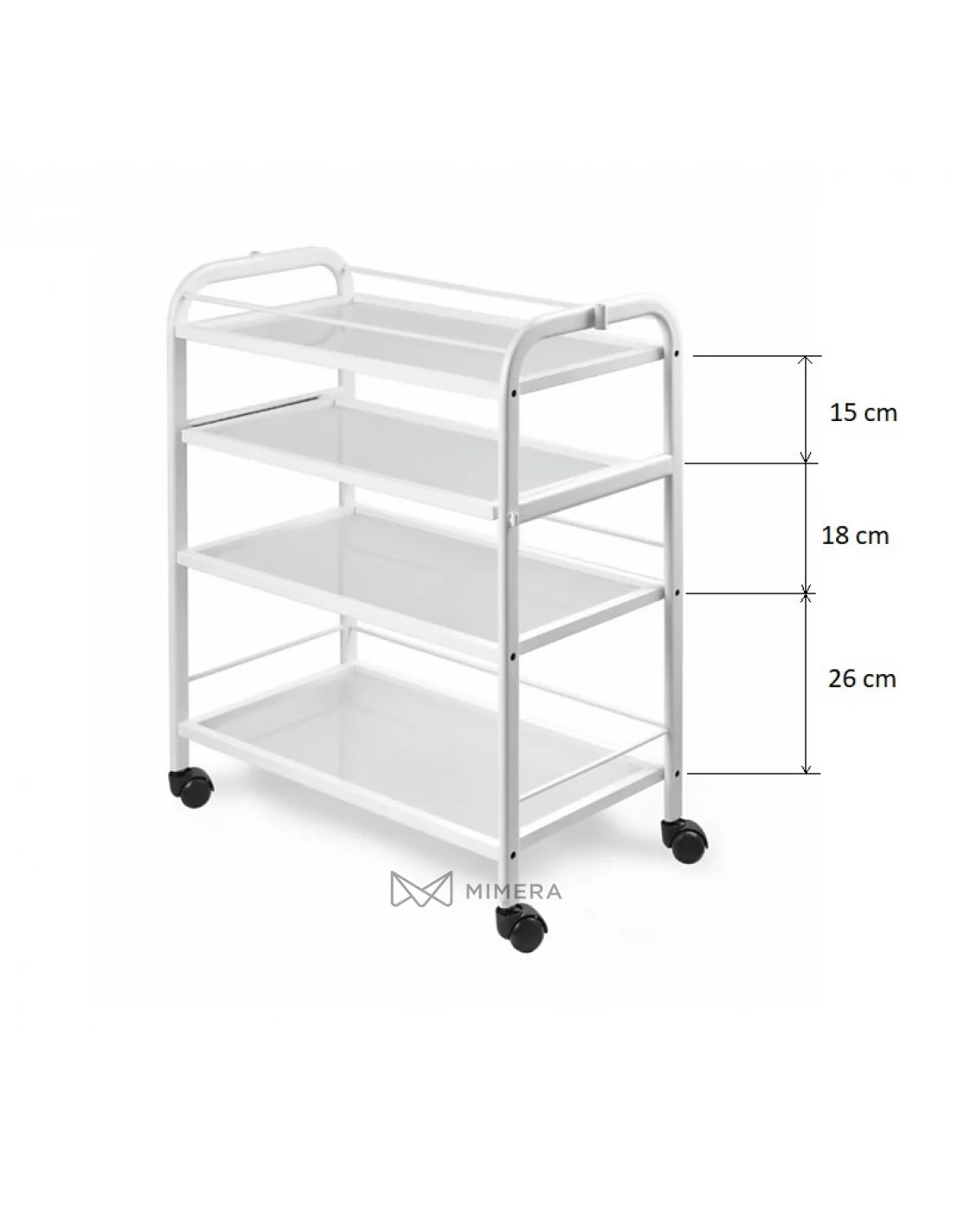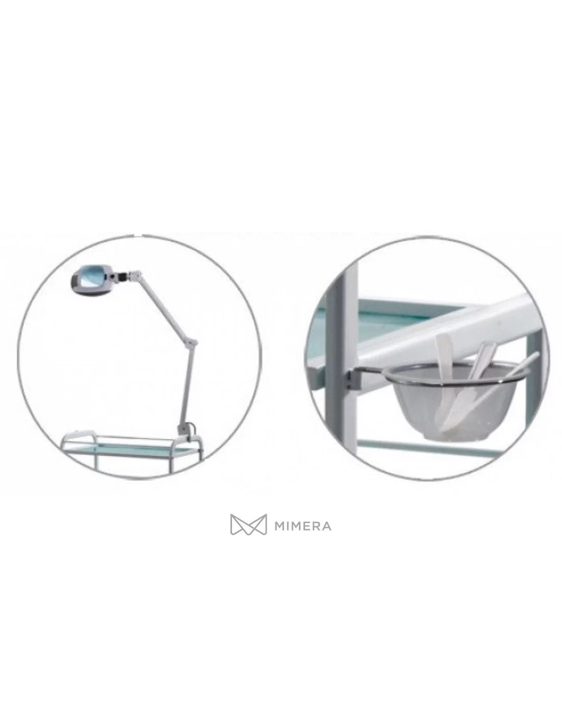 This cosmetic trolley UNIQUE 2 will make your workday easier. In addition to its elegant design, it also convinces with its functionality. It has 4 shelves of tempered glass, while the second shelf is extendable. The table offers enough space for your utilities and allows very good sorting of items on the table. In addition to sufficient space, the trolley also offers the possibility of attaching lamps to the table structure.
