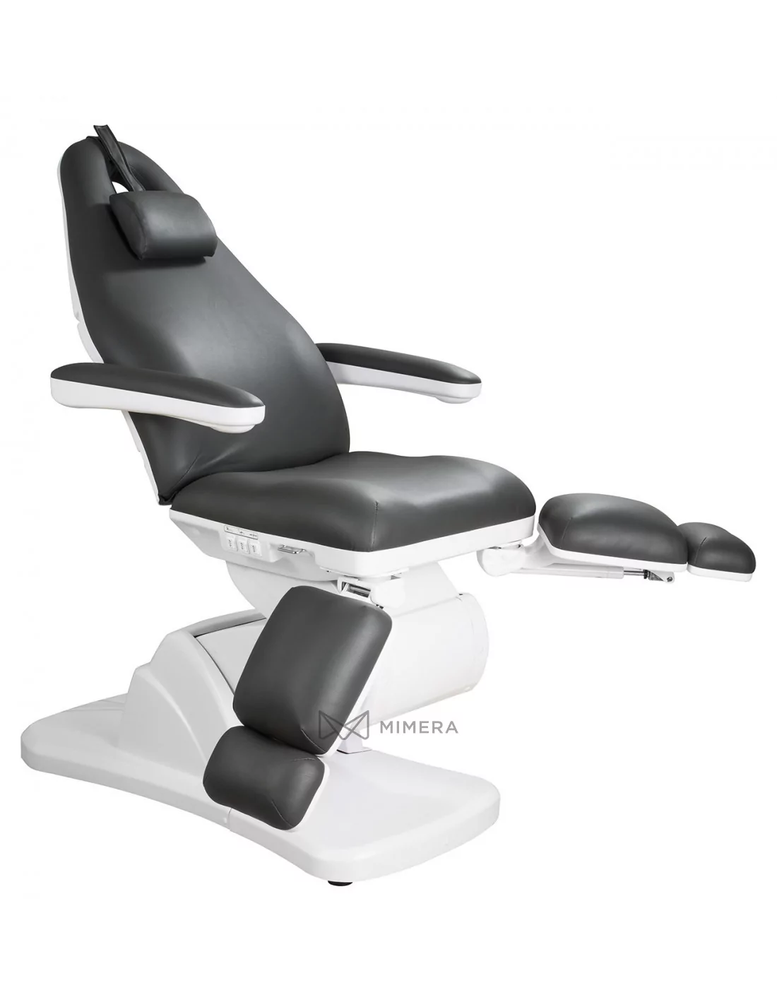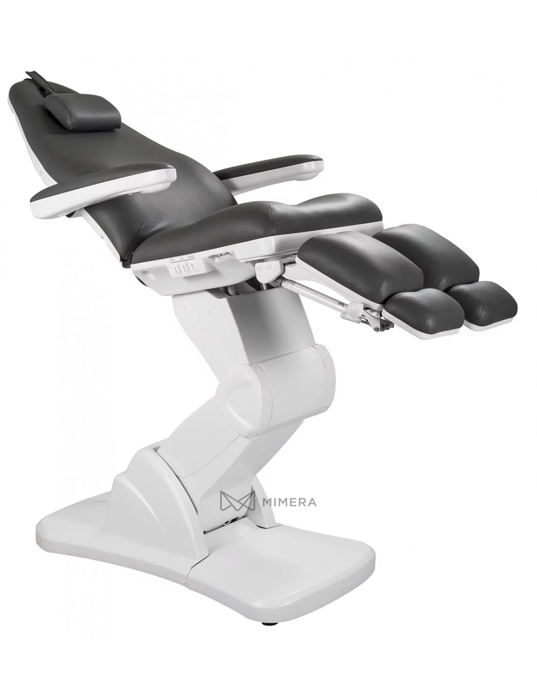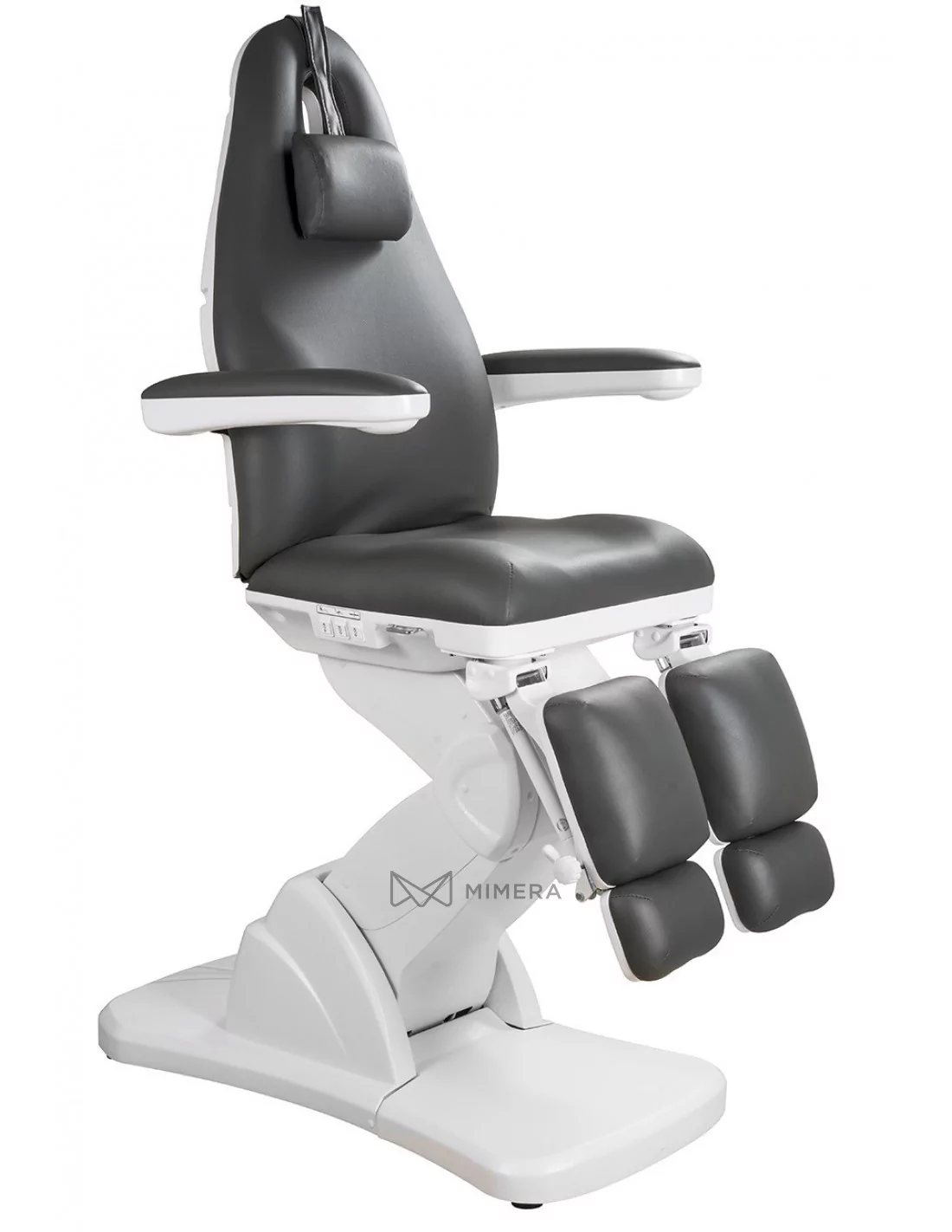 Stylish pedicure chair BARON with 3 motors to adjust the height, backrest and seat tilt. The legs are swiveling sideways by 90 °, vertically adjustable continuously by a pneumatic lever and are also extendable.