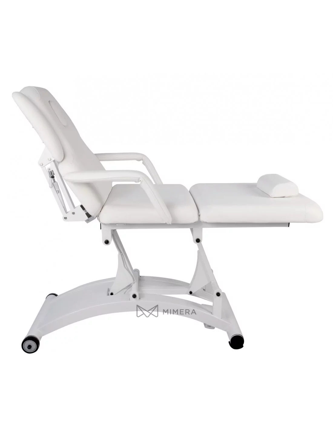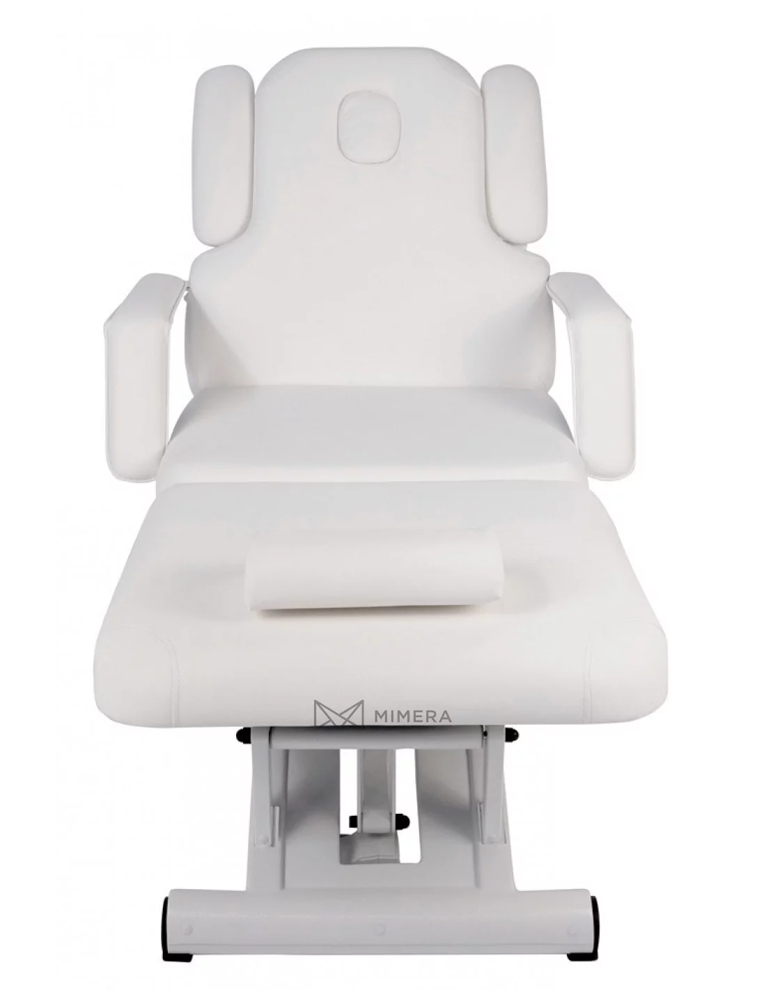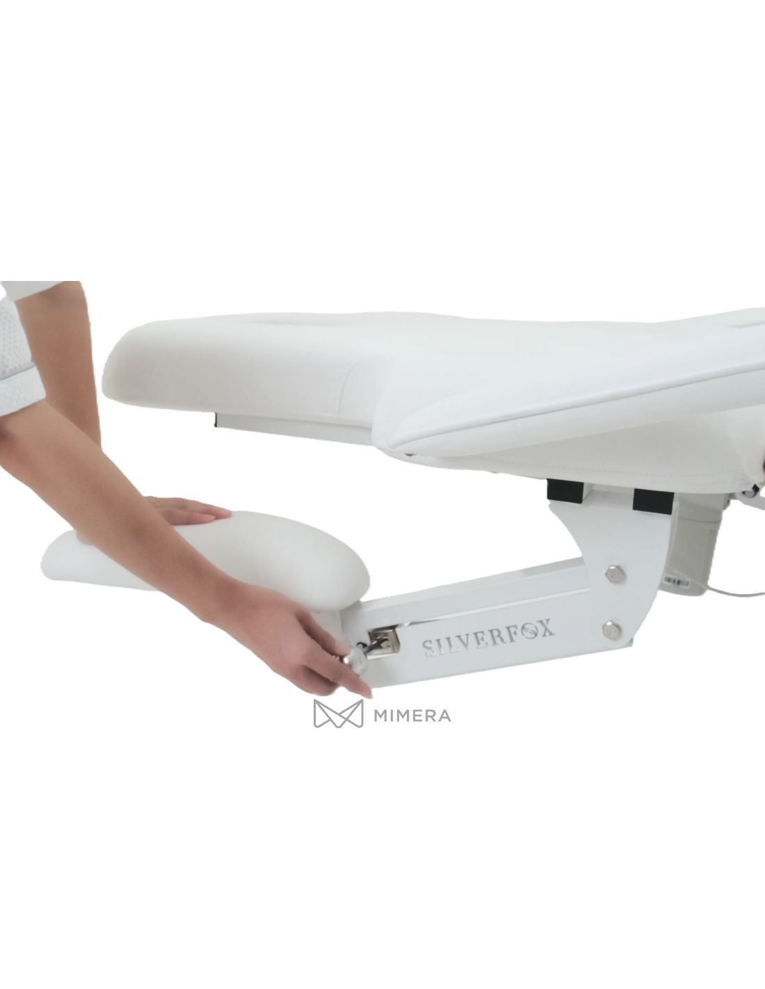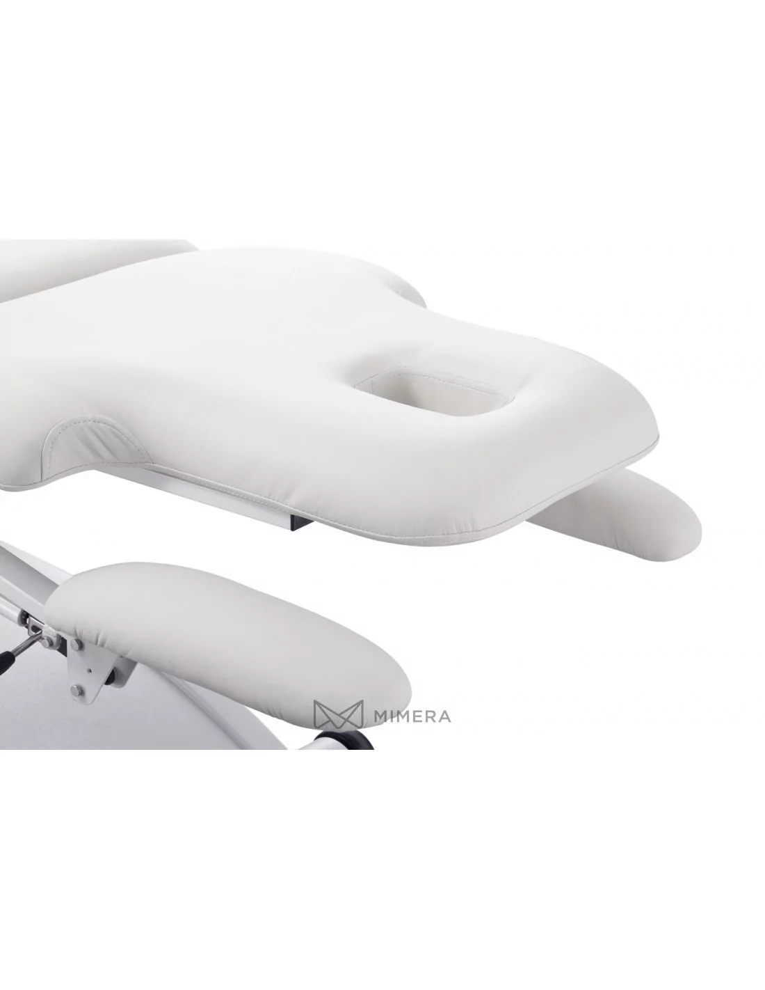 The chair features a double armrest system. Fixed 12cm wide armrests are infinitely adjustable with a pneumatic lever. Removable 11cm armrests are flexible to accommodate the position of the couch. The couch also includes a face opening, allowing multiple treatment positions. The bed has a foot pillow for maximum comfort.