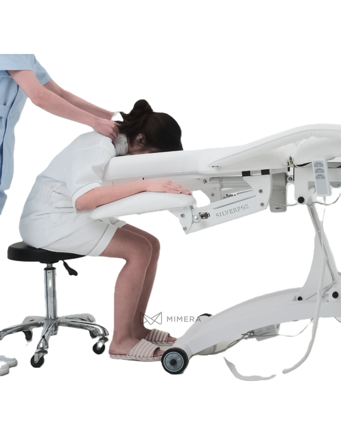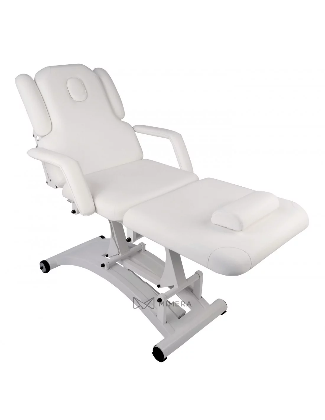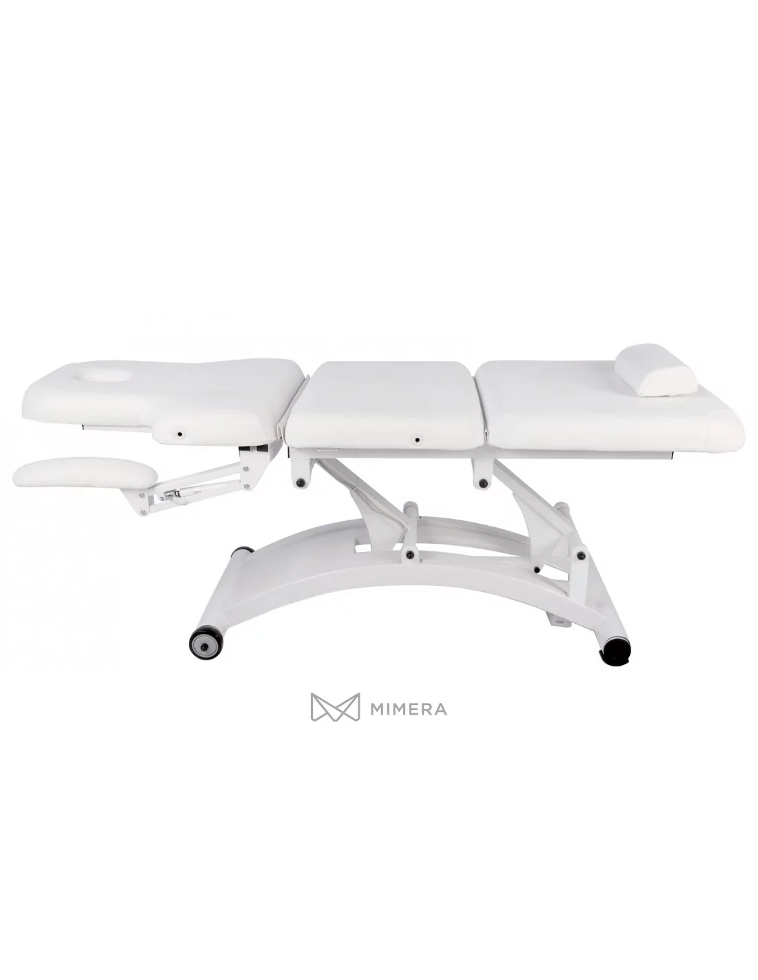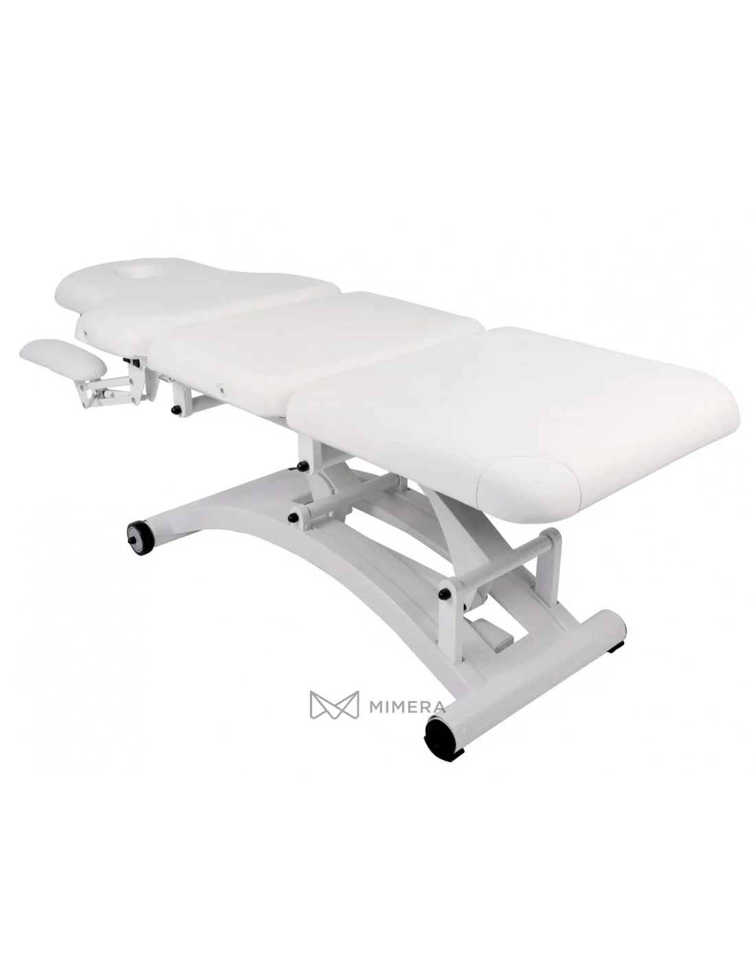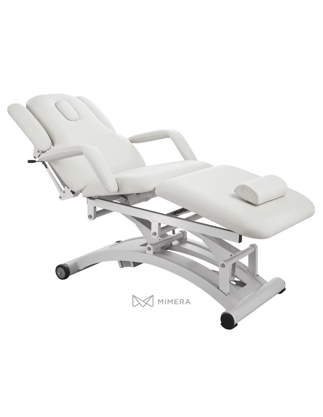 The chair features a double armrest system. Fixed 12cm wide armrests are infinitely adjustable with a pneumatic lever. Removable 11cm armrests are flexible to accommodate the position of the couch. The couch also includes a face opening, allowing multiple treatment positions. The bed has a foot pillow for maximum comfort.