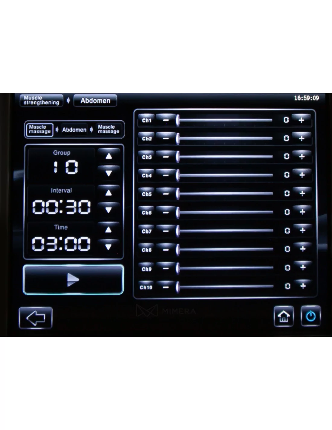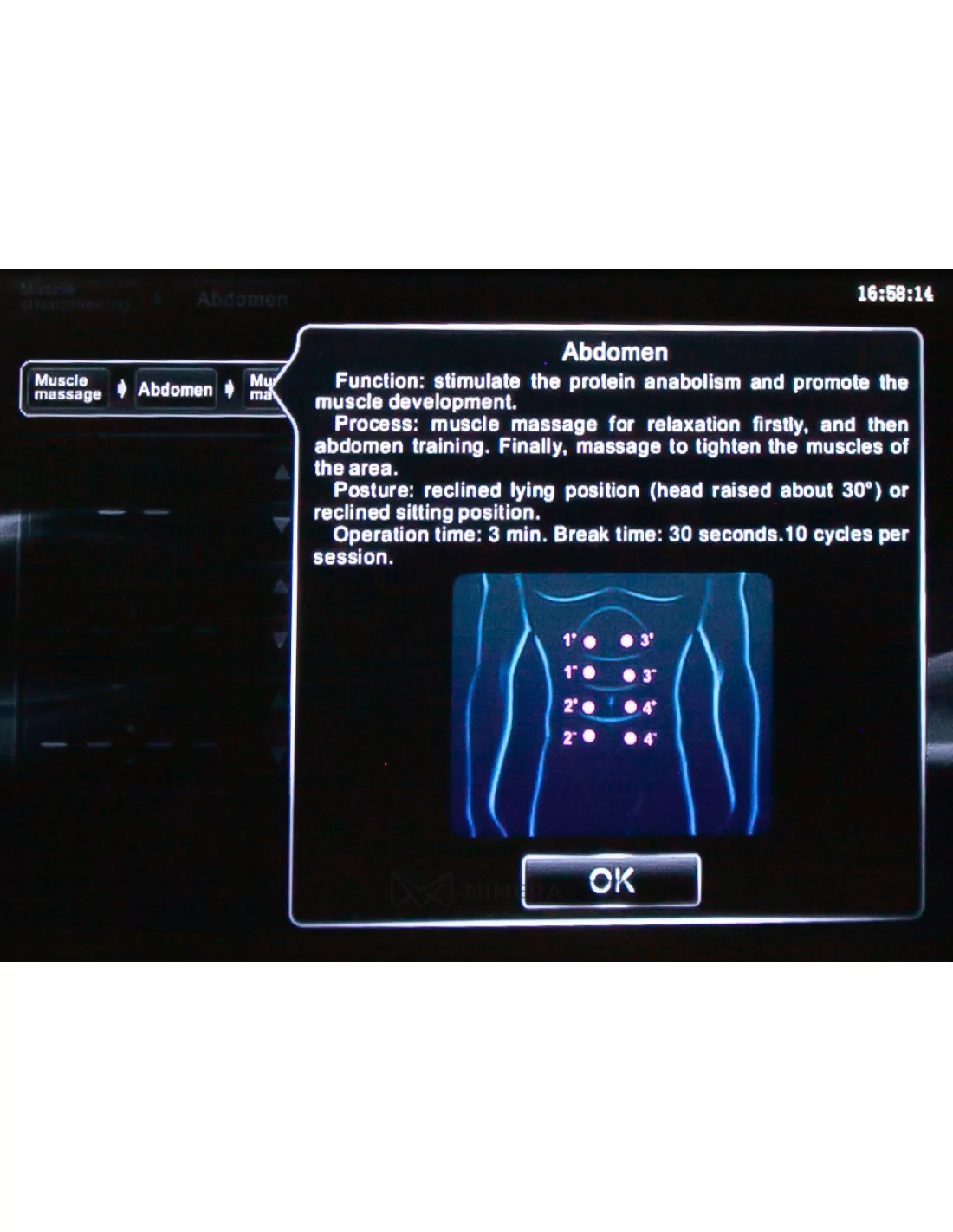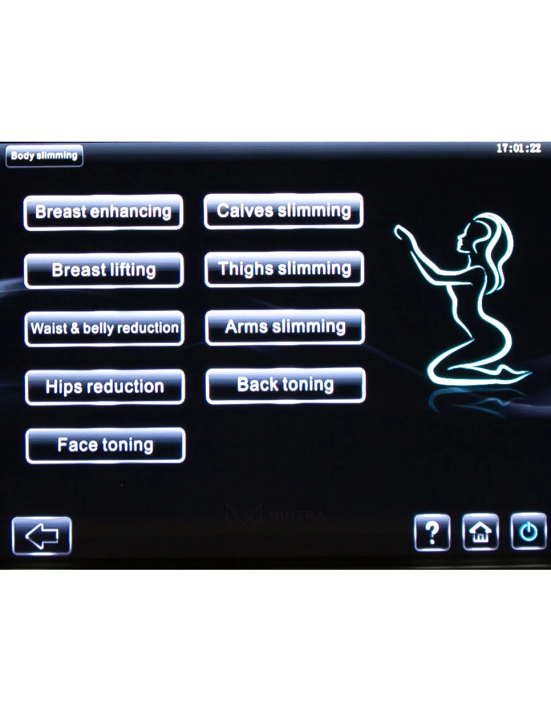 Each of these programs offers special programs according to the area and the desired effect with the selected procedure. The process of the procedure is briefly characterized on an 8 \"LCD display, which also shows the exact placement of electrodes on the body.
