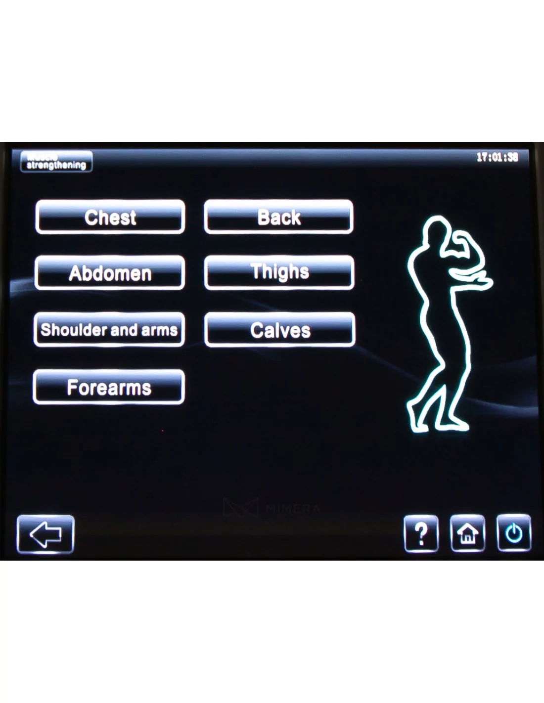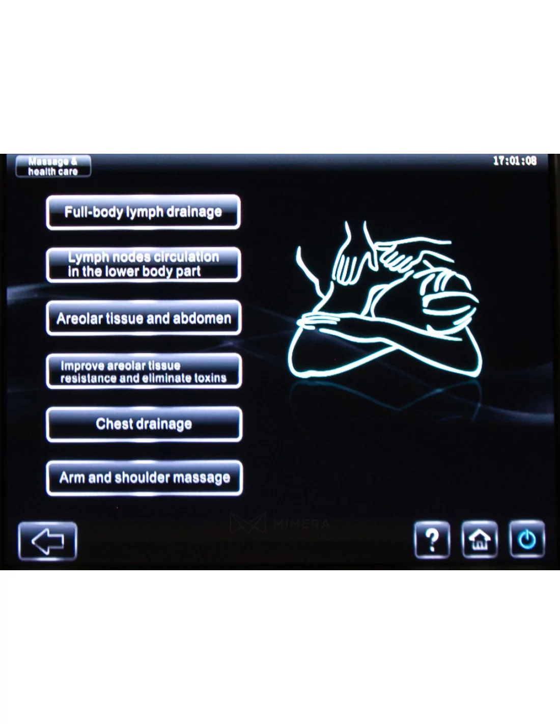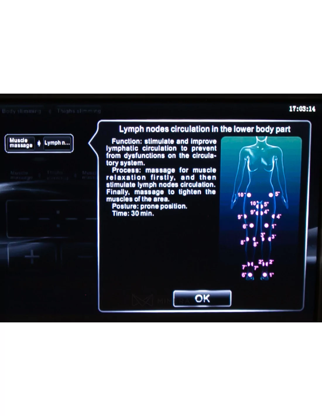 Each of these programs offers special programs according to the area and the desired effect with the selected procedure. The process of the procedure is briefly characterized on an 8 \"LCD display, which also shows the exact placement of electrodes on the body.