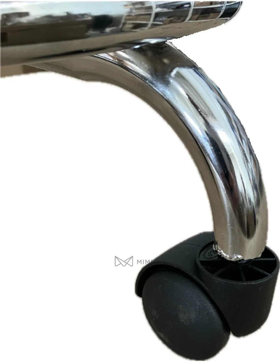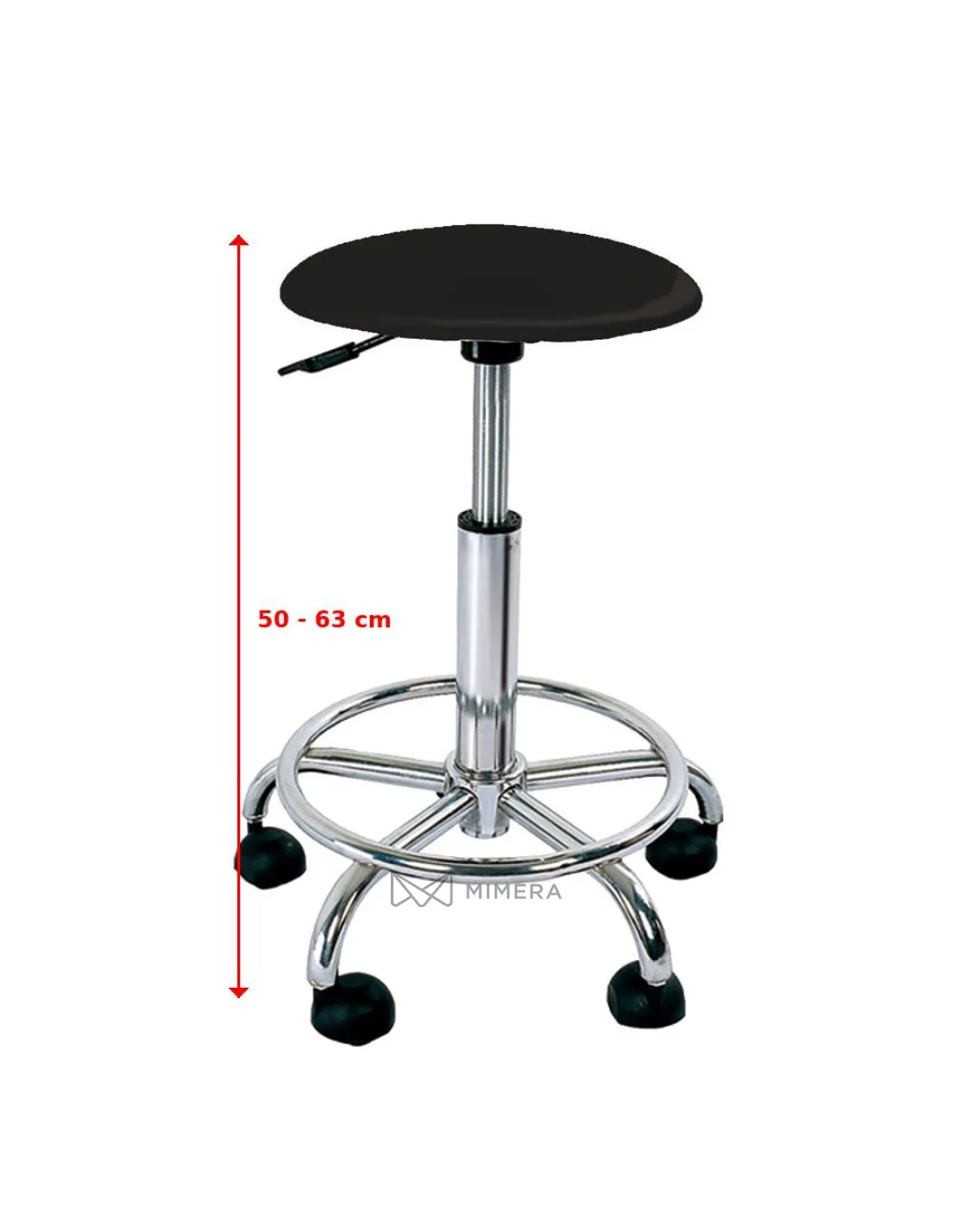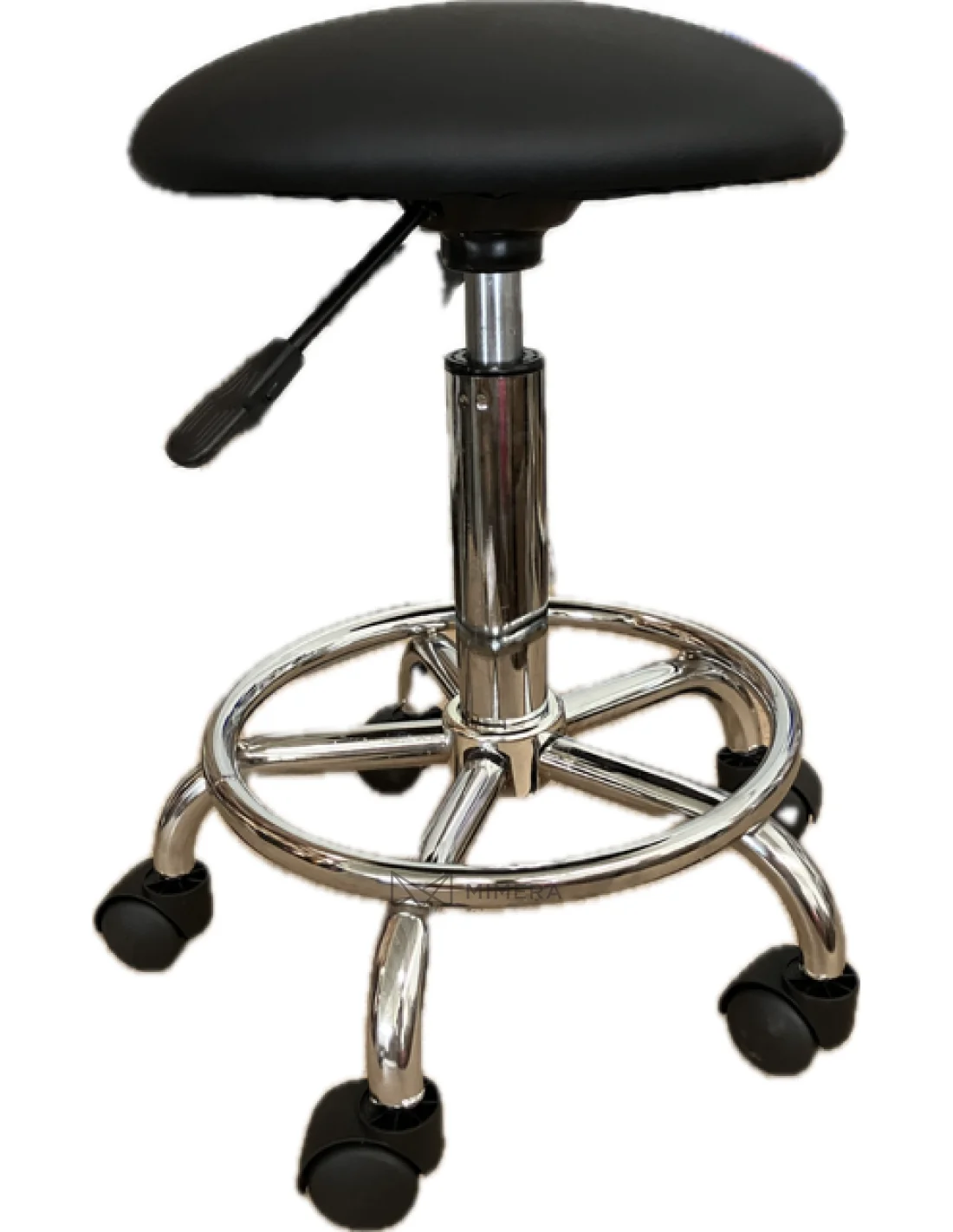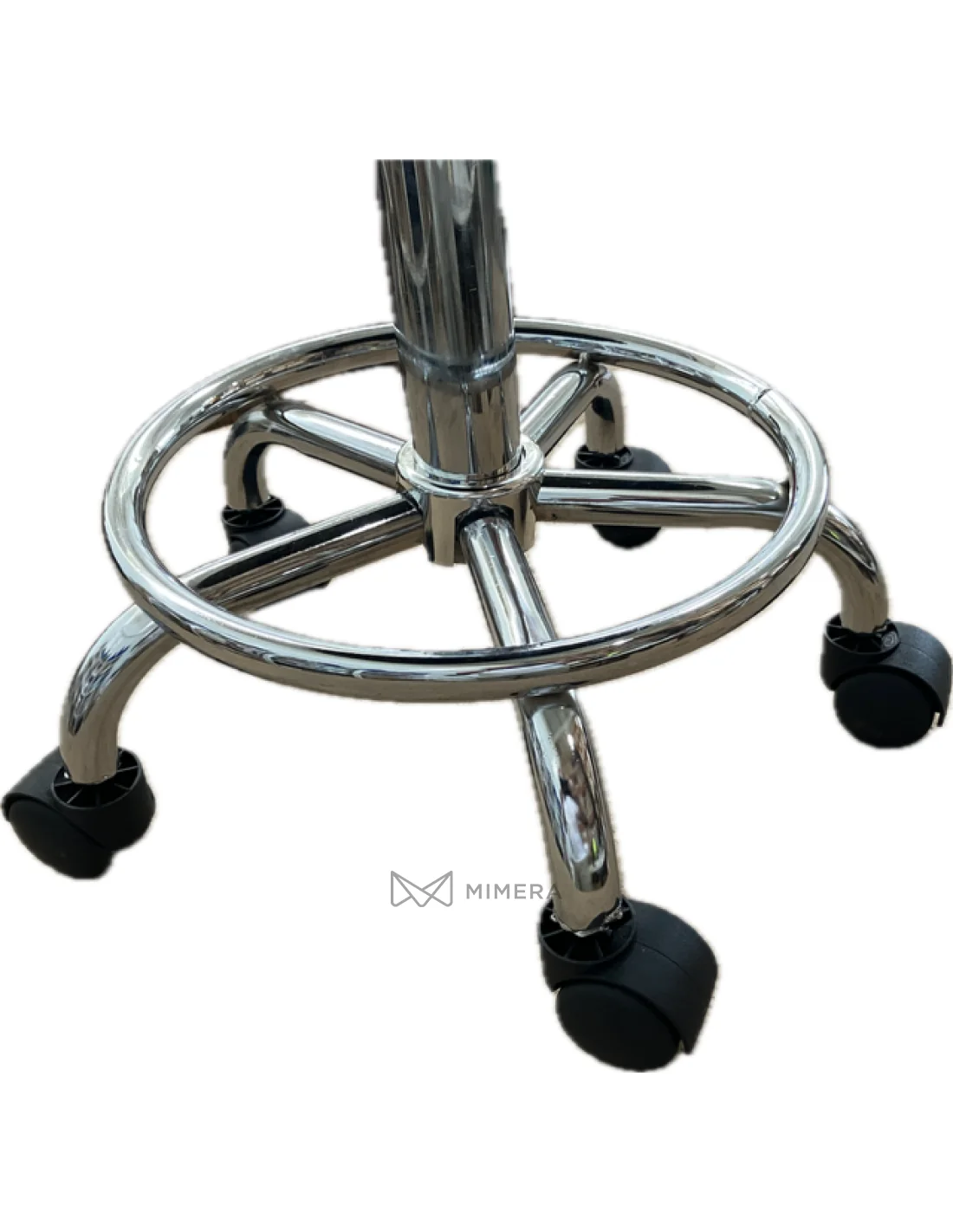 Hairdressing chair with mushroom-shaped upholstery. Integrated oil pump allows the seat to be raised and rotated 360 degrees. The chair has very durable upholstery and a sturdy, hard-wearing construction with round footrest.