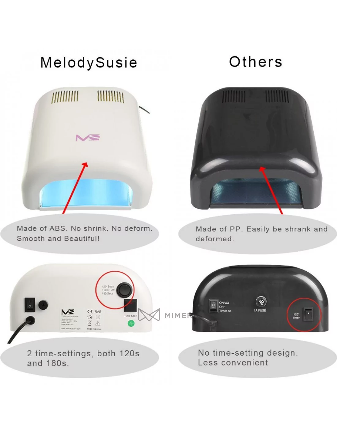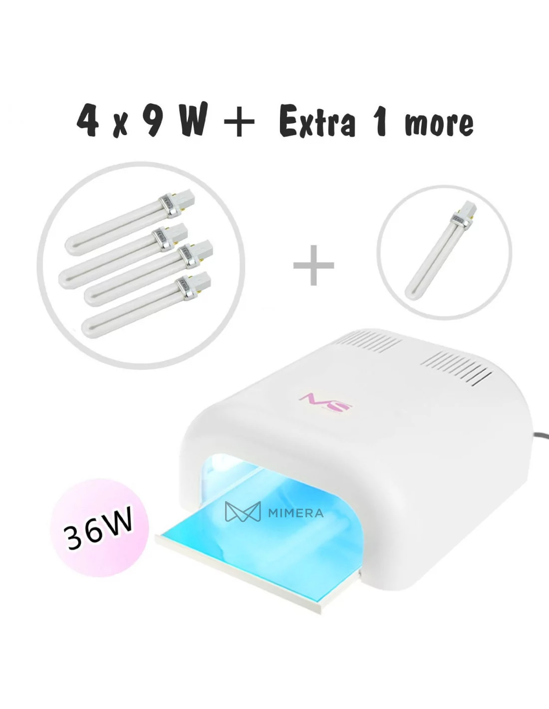 This professional 36W UV Nail Lamp has four 9W UV lamps and one extra bulb for replacement. The integrated timer control of 120 or 180 seconds stops automatically and allows you to work efficiently. The high performance of the PL UVA light gives a fast and gentle salon look.