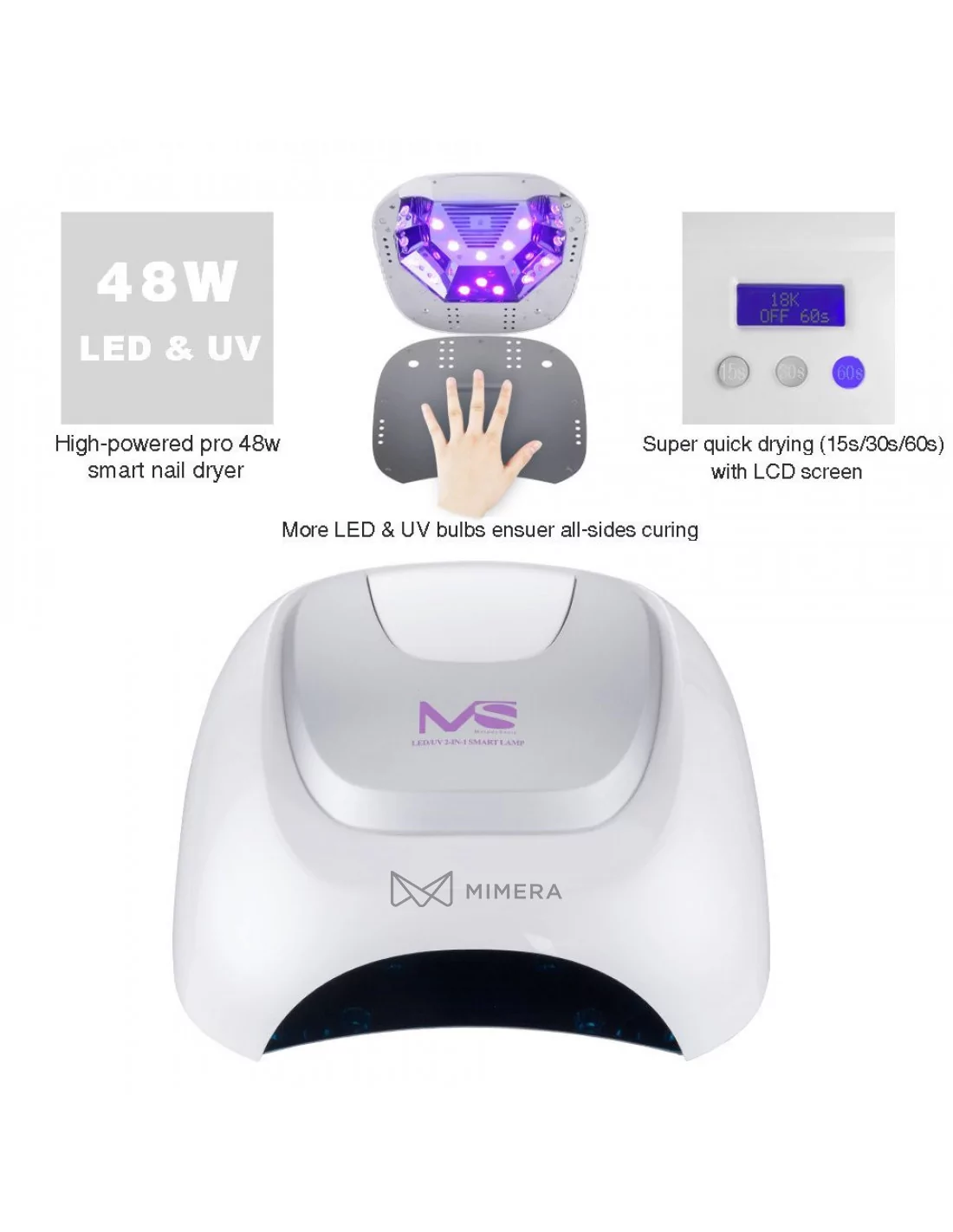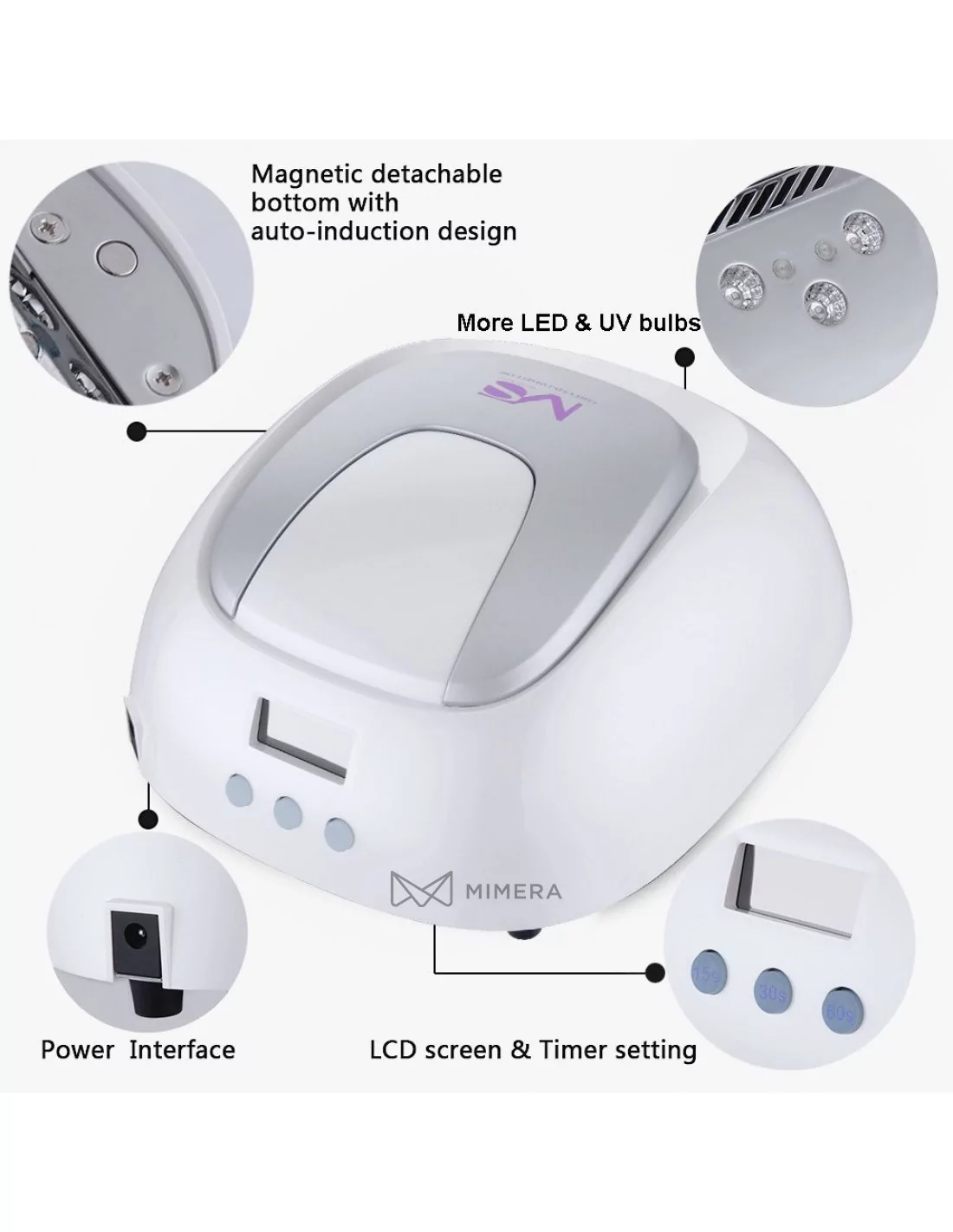 Due to its extremely high performance and lots of light bulbs, it can be in continuous use for 30.000 hours, providing maximum results, it is made for professional use. Its ergonomic shape allows a high level of comfort for customers and practitioners as well. It has a generous inner surface and still has a space-saving appealing exterior design. The device is compatible with almost all LED gel paints and impresses with its optimized timer function with 3 pre-set times of 5, 20 and 30 seconds - this prevents the excessive drying out of the nails. An included motion sensor turns on the dryer as soon as your hands or feet are in the unit. The removable magnetic base facilitates drying and cleaning.