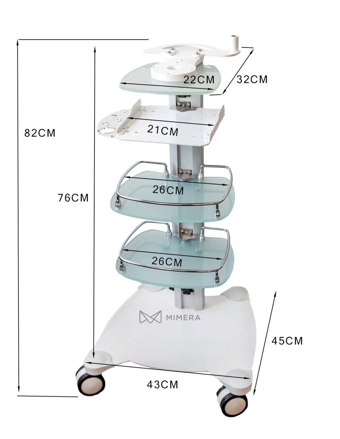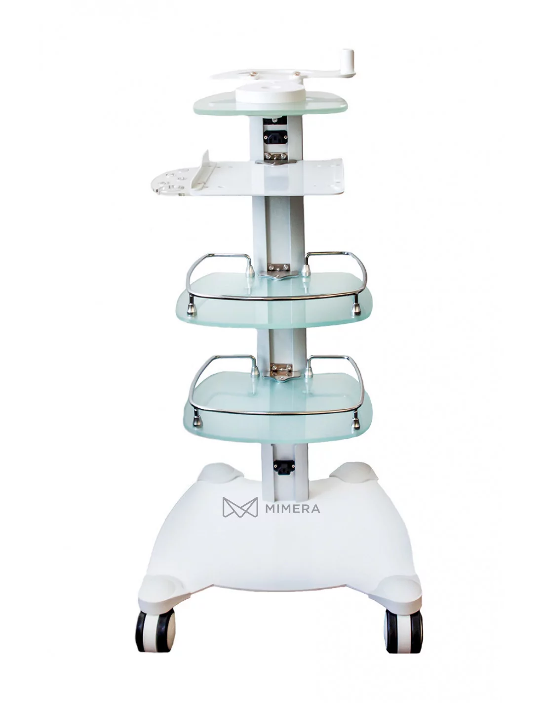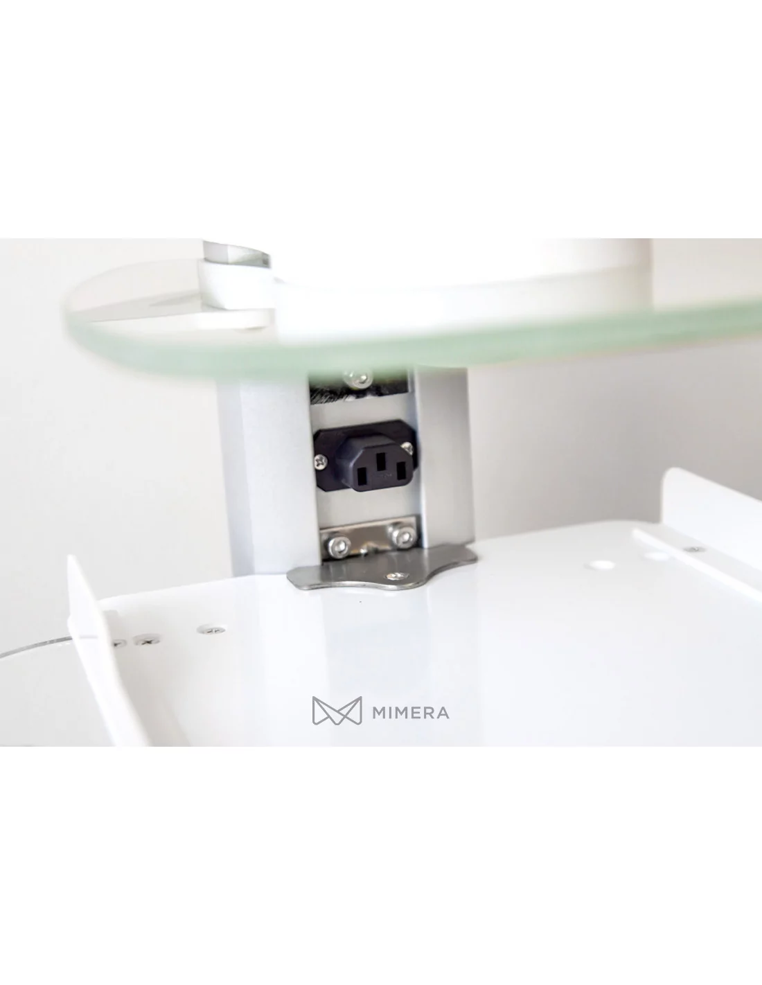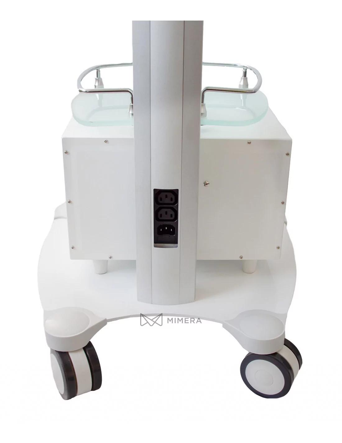 The multifunctional cosmetic stand is equipped with 2 glass shelves for storing cosmetic aids and 1 shelf for a cosmetic device, which you can choose from our offer. The WITTY digital steamer can be mounted on the top of the cosmetic stand. At the bottom of the stand can be plugged directly into the socket 7 L towel warmer. You can also choose a cosmetic lamp with a magnifying glass that can also be attached to the top of the stand from our offer. The back of the dispenser has an electrical plug for the power cord and 2 electrical sockets for cosmetics. The table has wheels to facilitate movement.