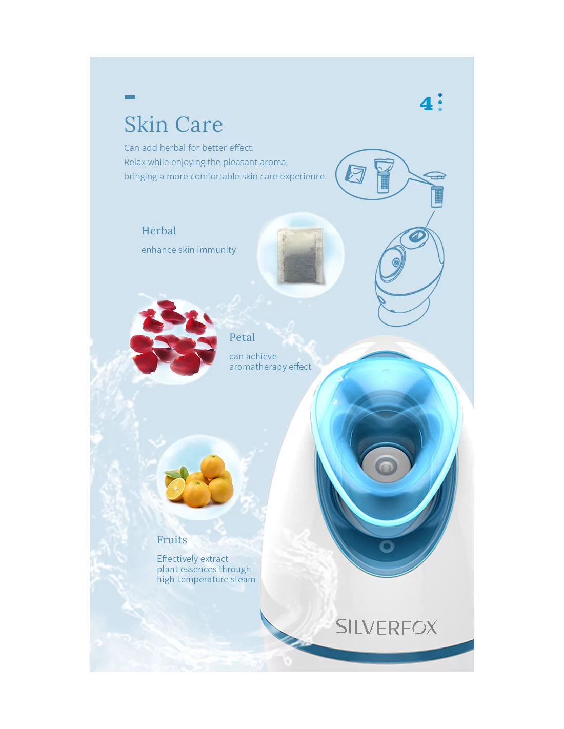 The modern compact steamer MIGNON convinces with simple operation, compact dimensions, adequate performance as well as rich functions. The steamer has an adjustable face applicator (10°) for a wider range of coverage. This allows precise work not only on the face, but also on the chin, neck or other parts of the body. It contains an eco-friendly water container made of food-grade material ensuring you won't smell plastic when heating. This container has a capacity of 130 ml. Moreover, this clever steamer also includes a net and a cap for herbs which allows you to add herbs, flower petals and fruits for a better and more pleasant effect.