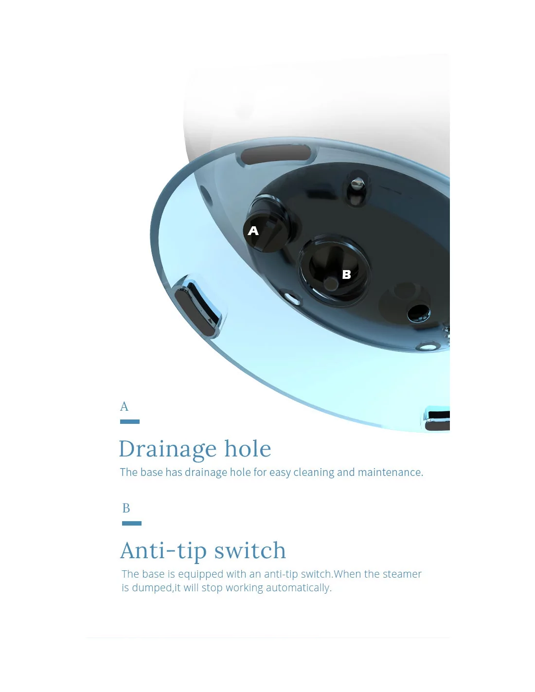 Safety features such as auto shut-off and auto tip-over switch prevent dry burning when the water in the container is used up, and accidents should the device fall over.