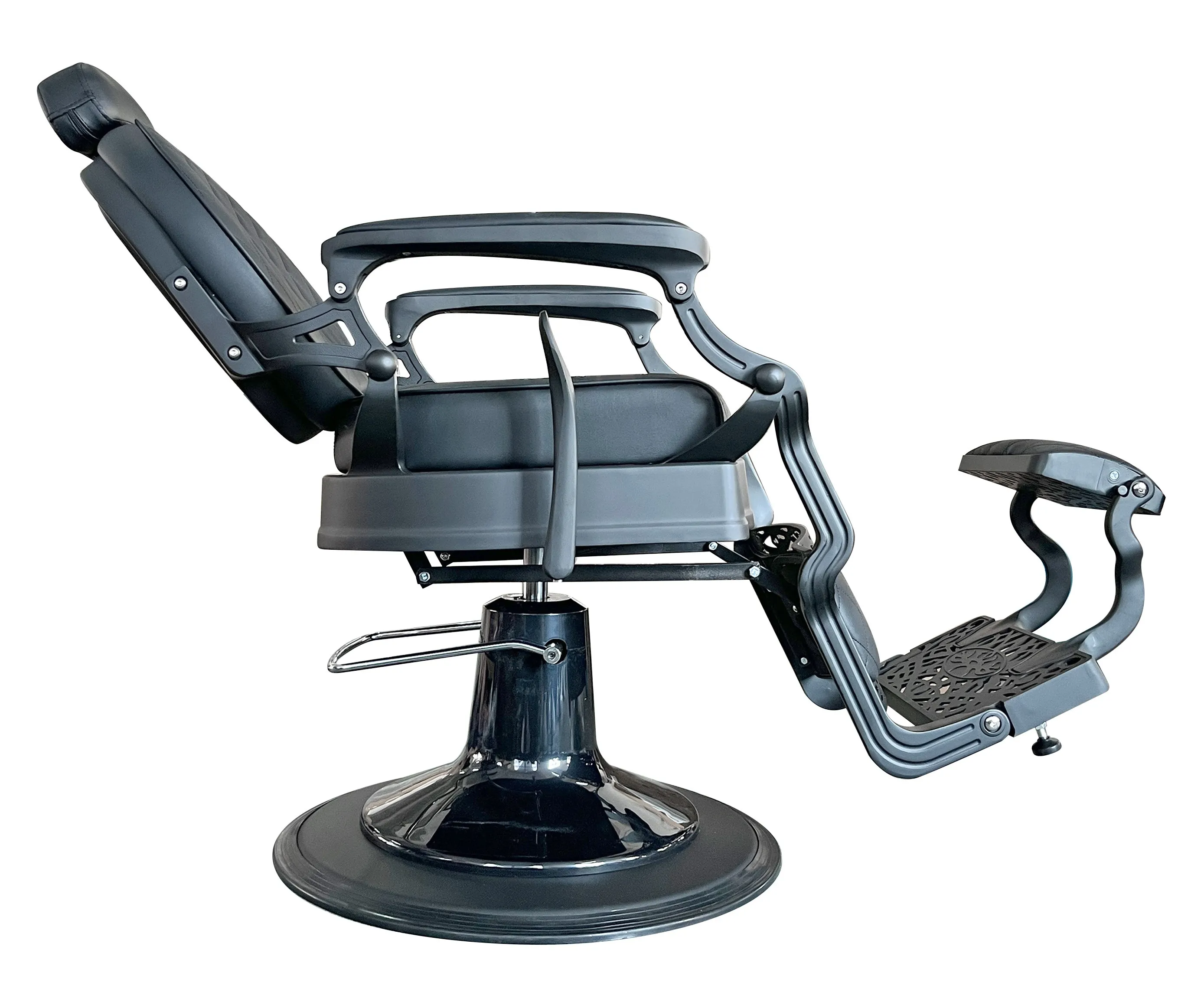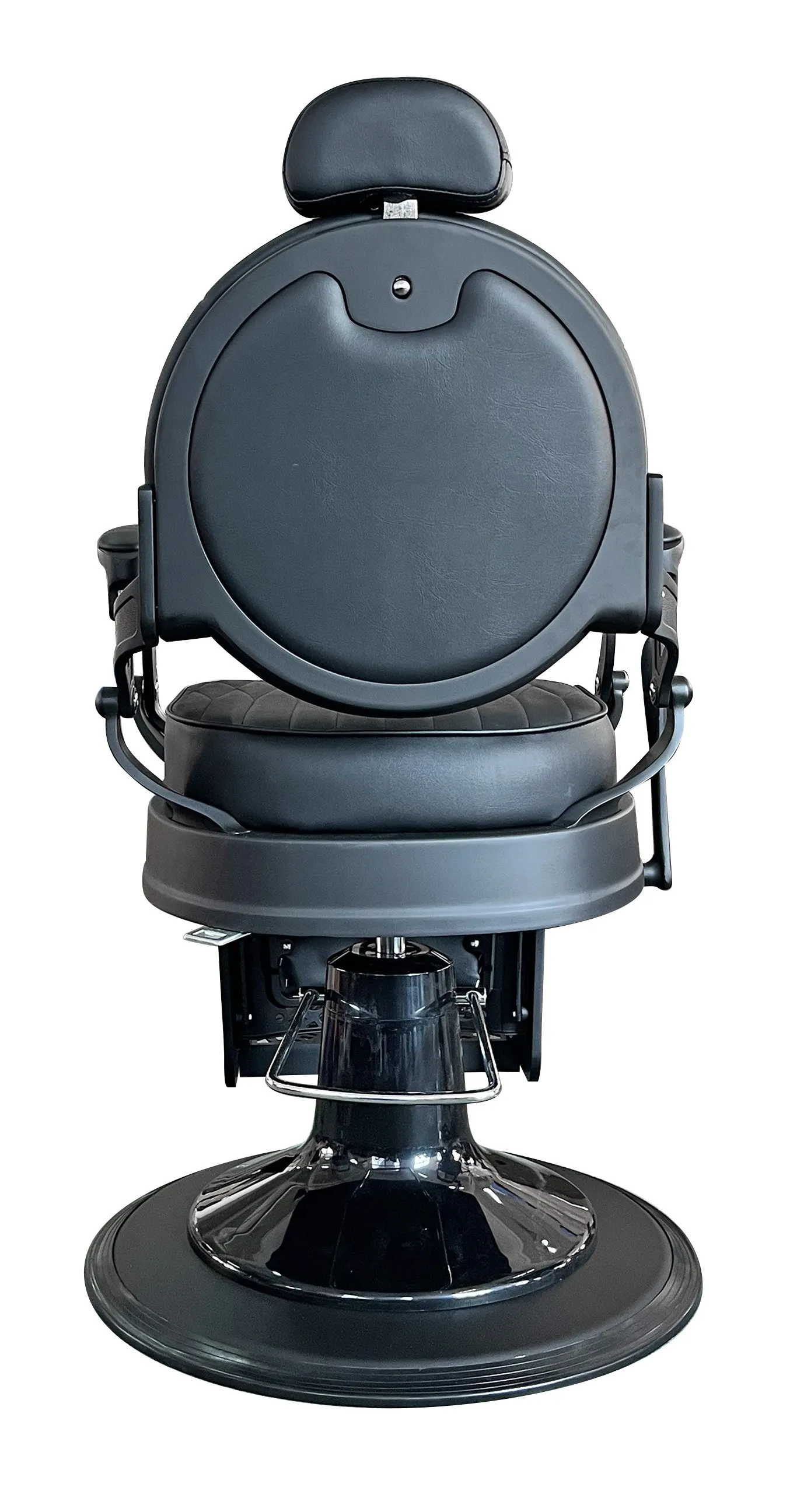 The matte black steel frame paired with black quilted upholstery creates an elegant dark classic style that stands out in any barbershop.