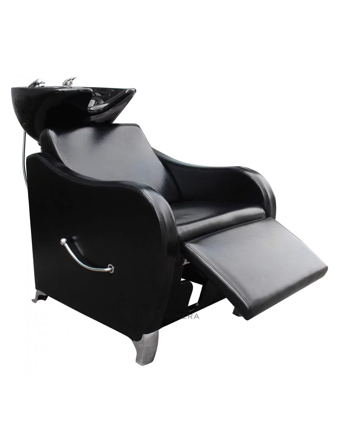 Comfortable washbasin box in a robust style with a deep ceramic washbasin, metal legs and upholstered armrests. The seat is soft and comfortable. Ideal for busy hairdressing salons or barbershops.
