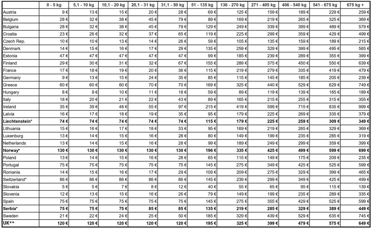 * Note for shipments to Liechtenstein, Norway and Serbia: