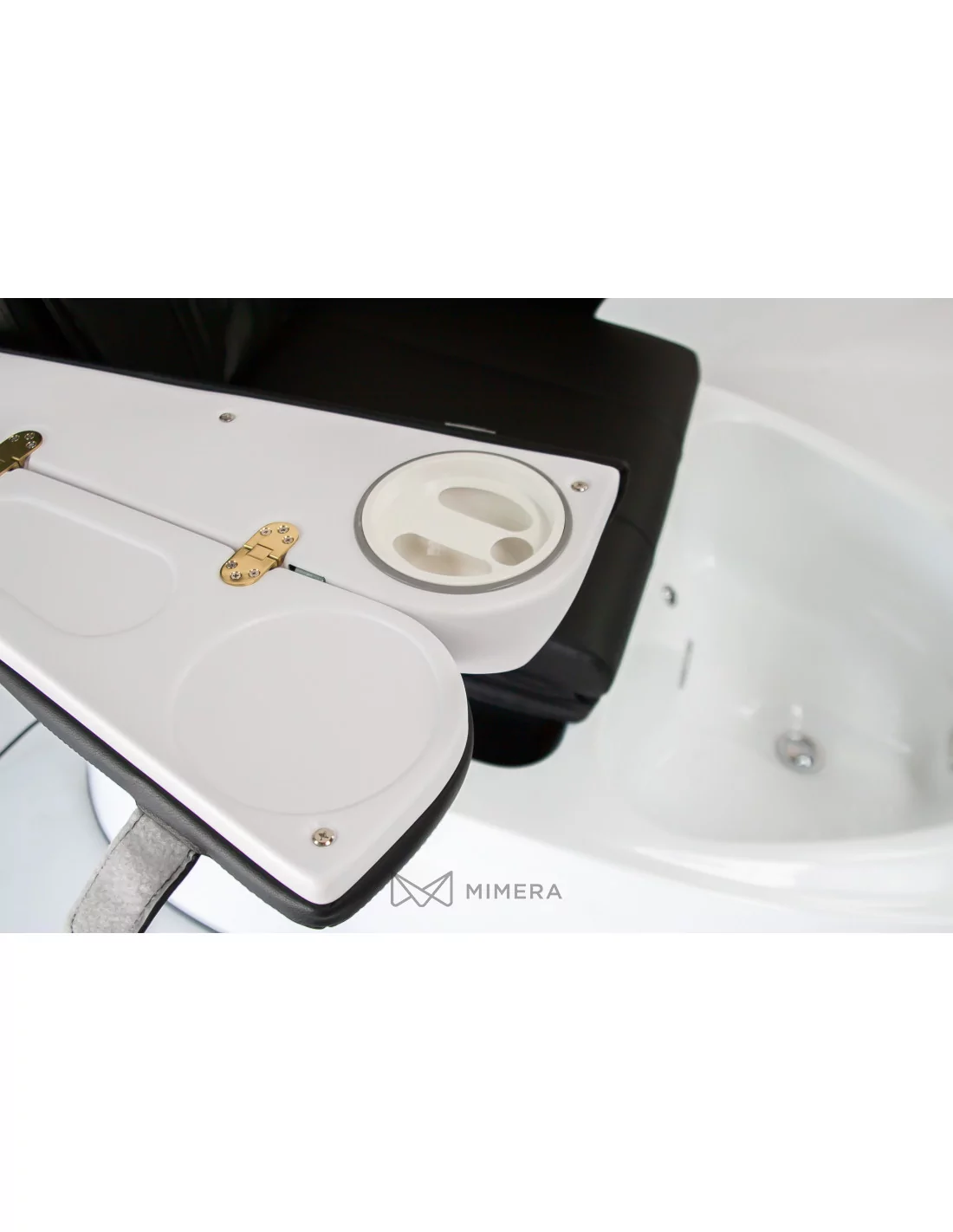 When sitting down, clients will appreciate the foldable armrests, which make it easy to settle into the extremely comfortable upholstery. The upper parts of both armrests can also be opened, revealing an integrated manicure bowl.