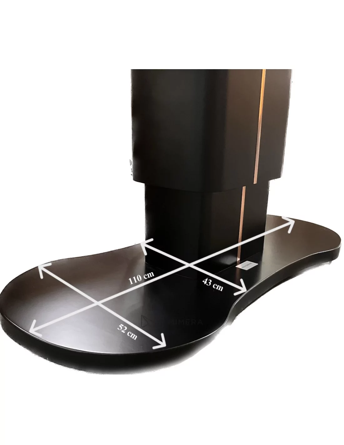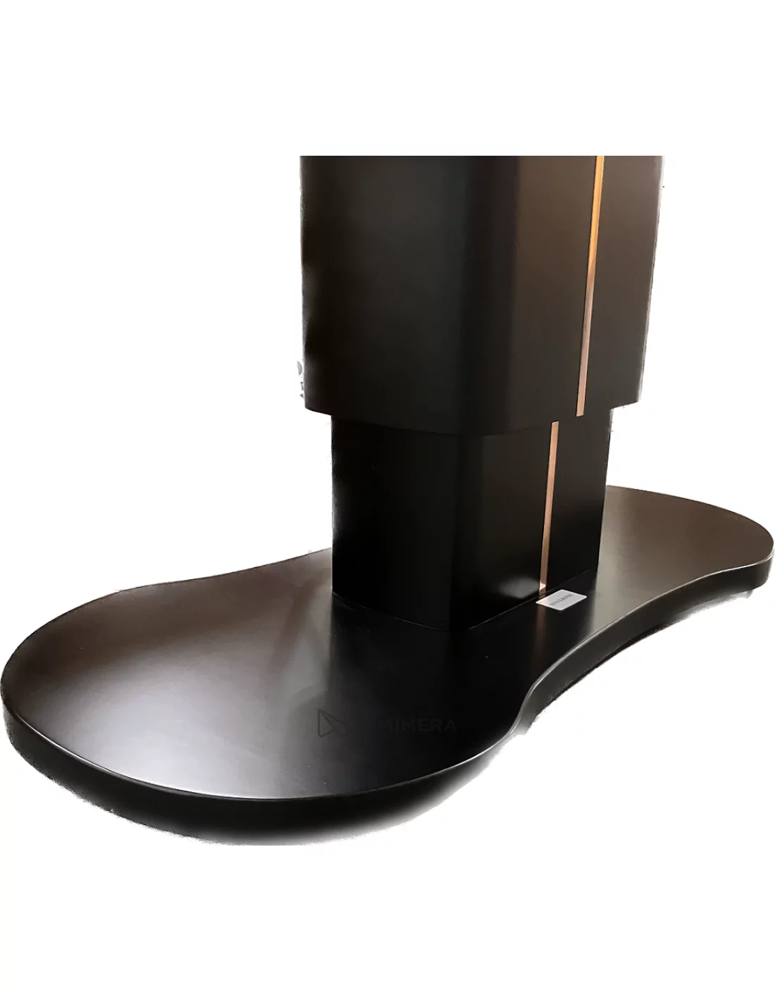 The base of the bed is extremely stable and sturdy. It comes in a smooth matt black wood finish and a subtle gold and red metal strip runs vertically through the base.