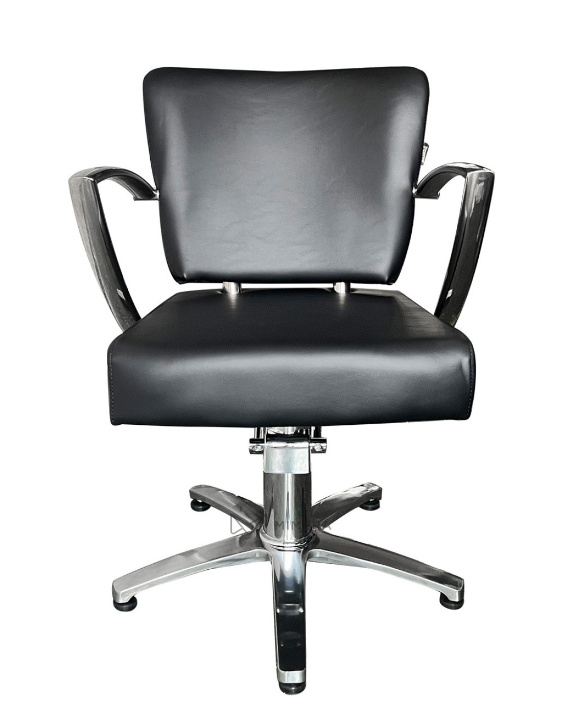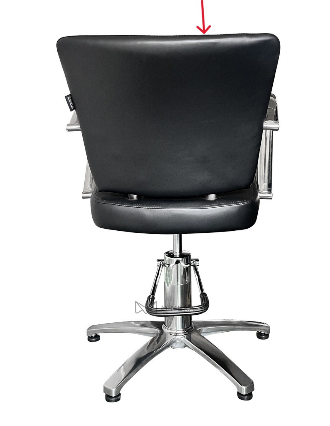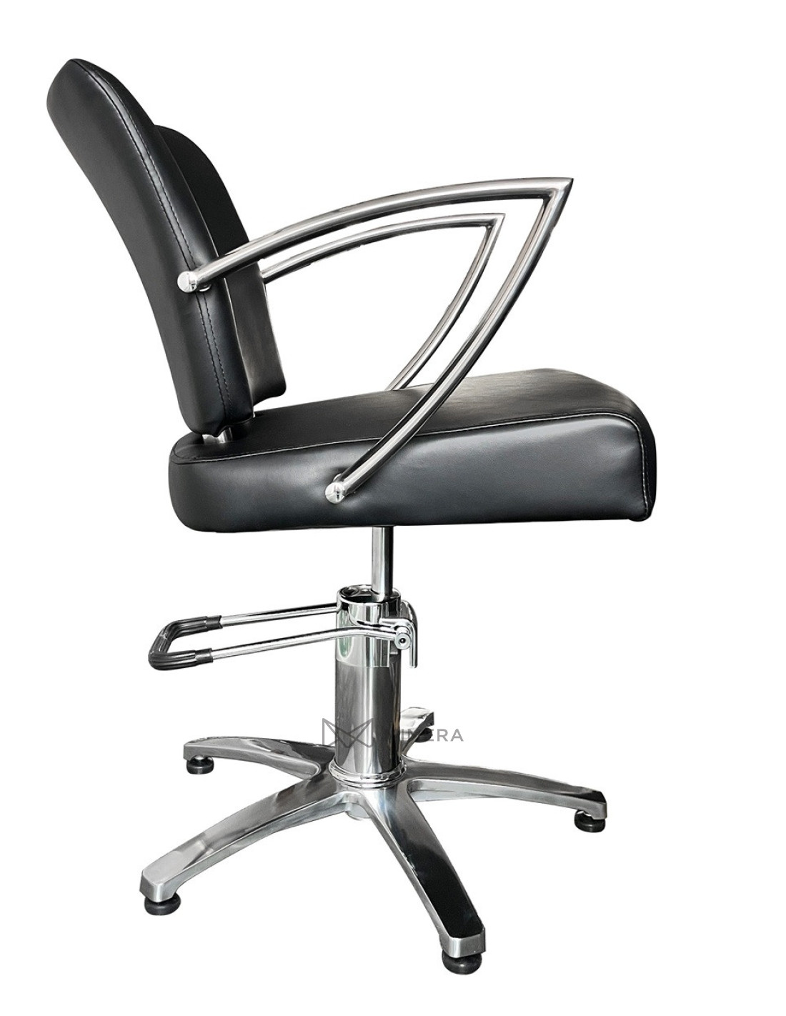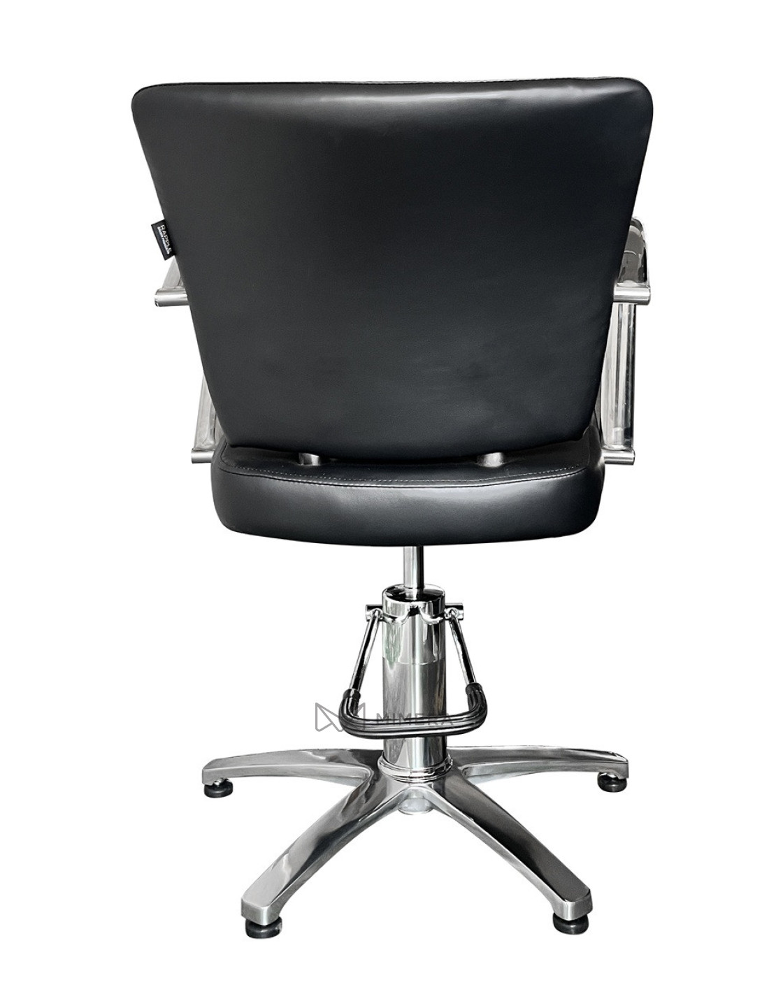 Modern, functional and eye-catching – the BASE CHROME hairdressing chair in matte black stands out at first glance. With sturdy metal armrests and comfortable upholstery, it offers a perfect blend of style and practicality for everyday salon use.