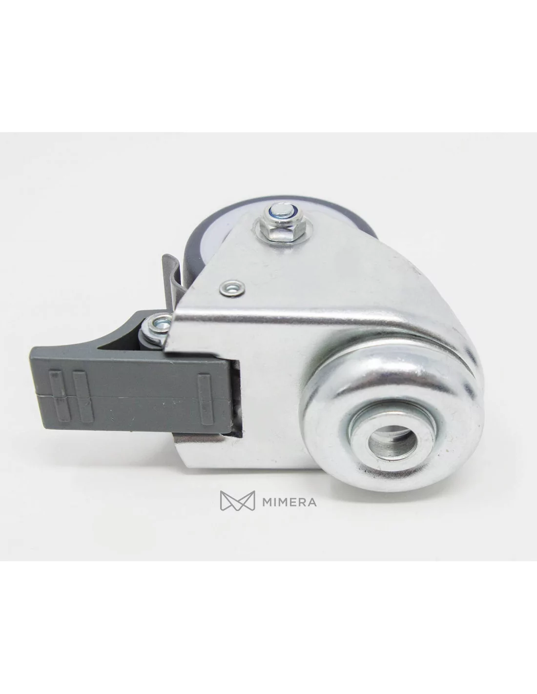 The caster features a thermoplastic rubber surface, allowing quiet and smooth rolling without damaging the floor. The deep groove ball bearing ensures fluid movement. The wheel disk is made of strong polyamide, while the housing and fork are made from galvanized steel sheet with double-row ball bearing guidance, enhancing load capacity and durability.