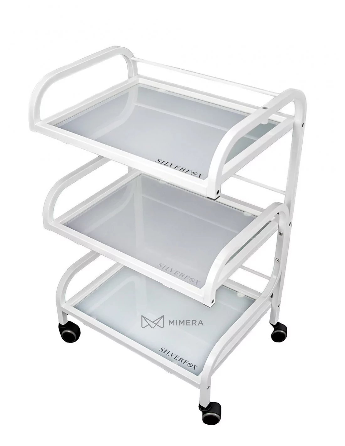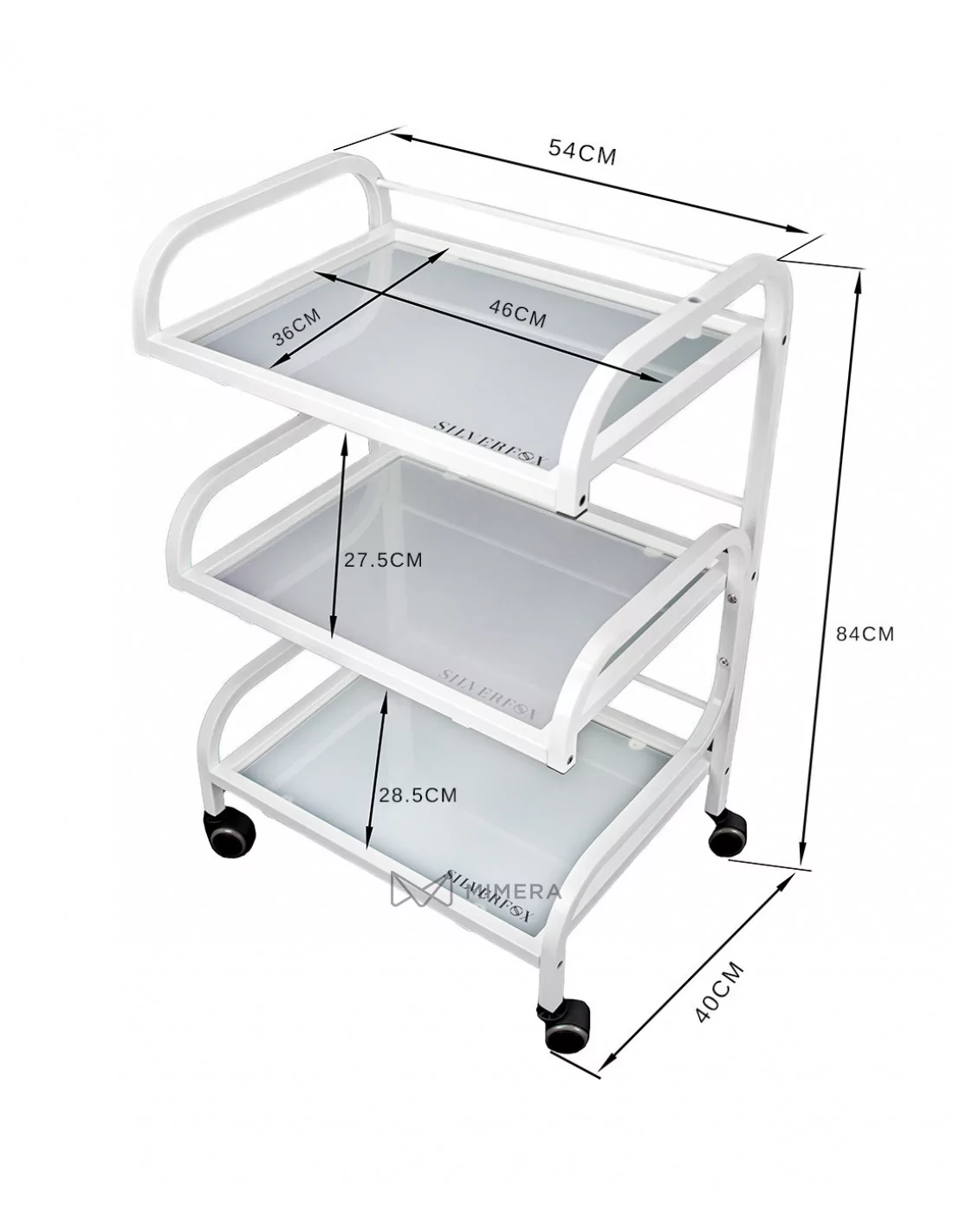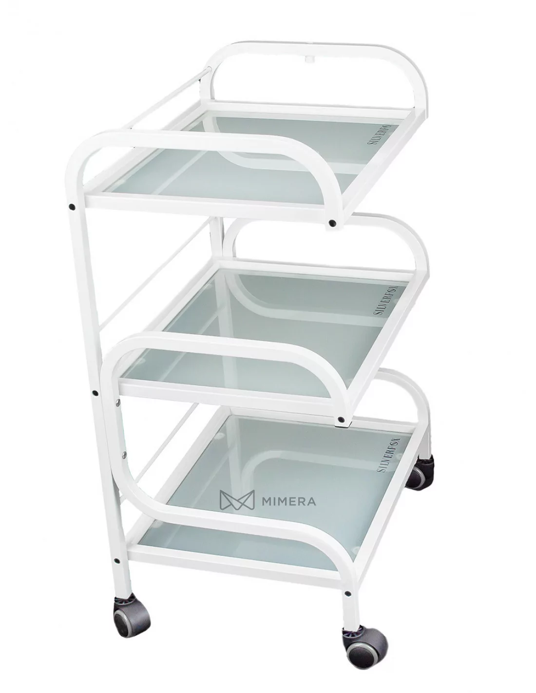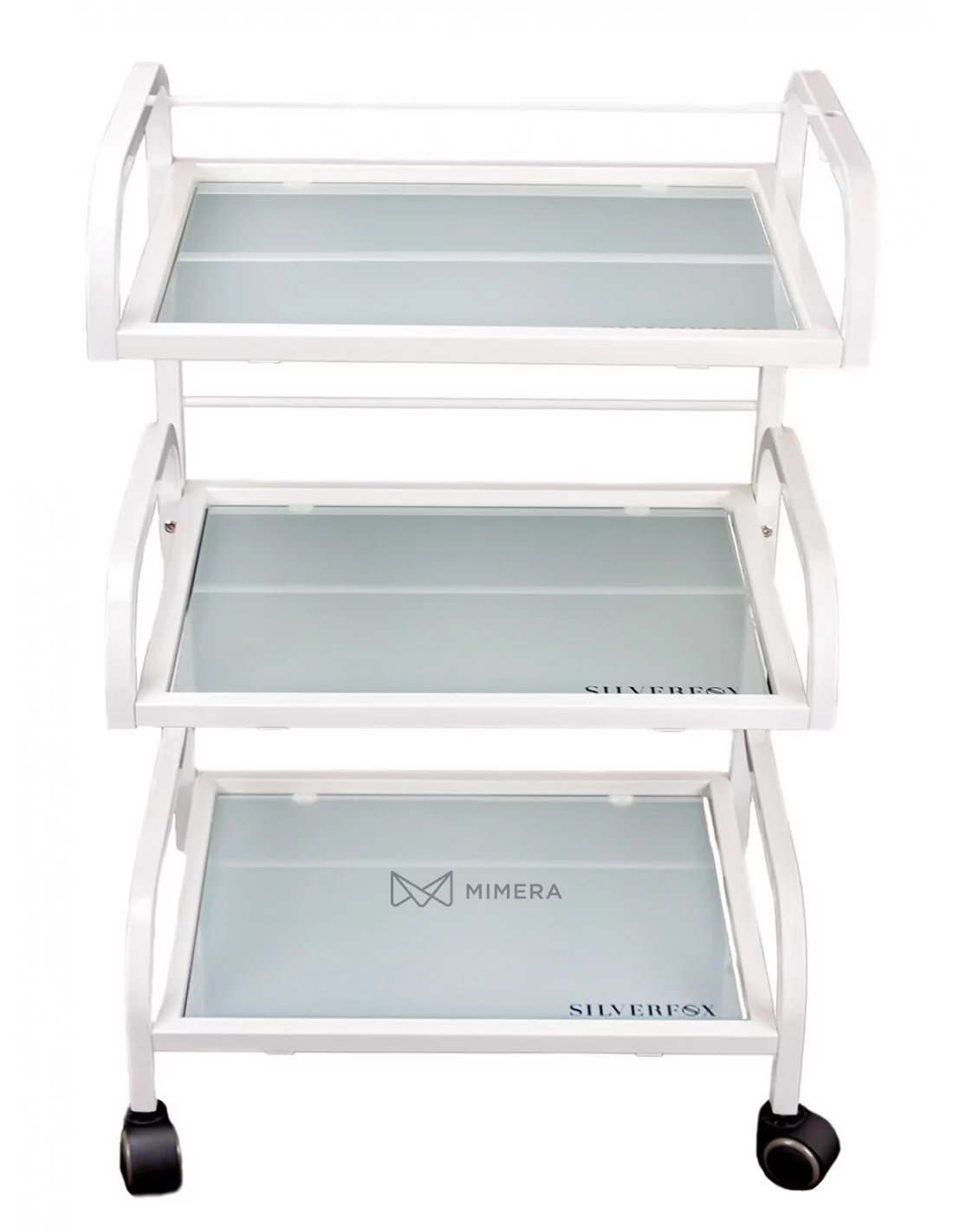Ten praktyczny stolik kosmetyczny o minimalistycznym wyglądzie wyposażony jest w 3 przezroczyste szklane półki. Jest w pełni mobilny z 4 kołami. Wózek Linea posiada otwór na lampę powiększającą.