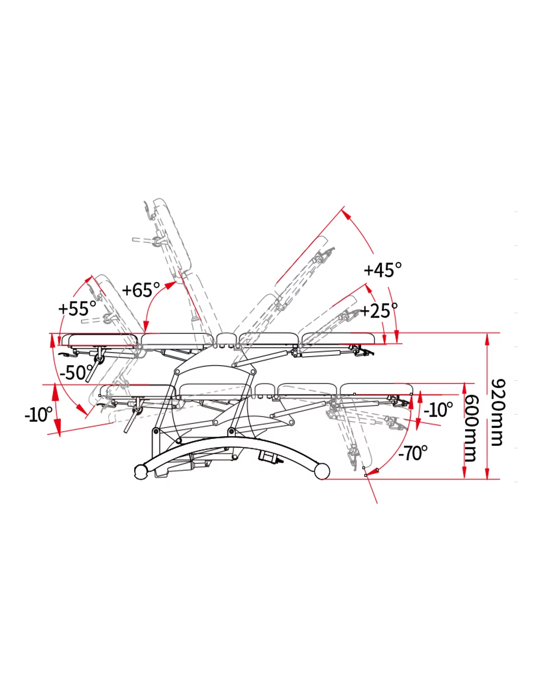 • 3 spoľahlivé motory pre ovládanie výšky (60-92 cm), chrbtovej časti (-10°~+65°) a nožnej časti (-70°~+45°)