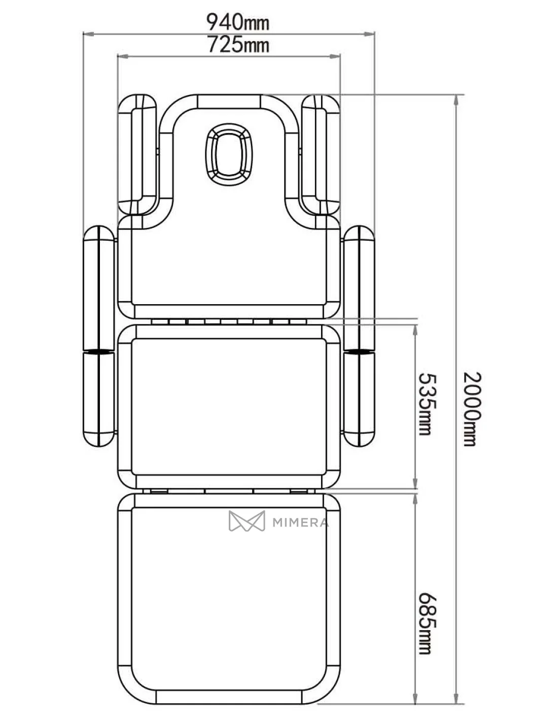 Kreslo disponuje dvojitým systémom opierok na ruky. Fixné opierky široké 12cm sa nastavujú plynule pneumatickou páčkou. Odnímateľné lakťové opierky široké 11cm sa flexibilne prispôsobujú polohe lehátka. Lehátko obsahuje aj otvorom na tvár, čo umožňuje viaceré polohy pri ošetrovaní. Vankúš pod nohy pre maximálny komfort.