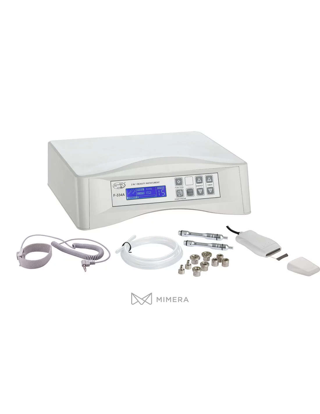Multifunkčný kozmetický prístroj F-334 kombinuje 2 funkcie: diamantovú mikrodermabráziu a ultrazvukovú špachtľu \"Skin scrubber\".