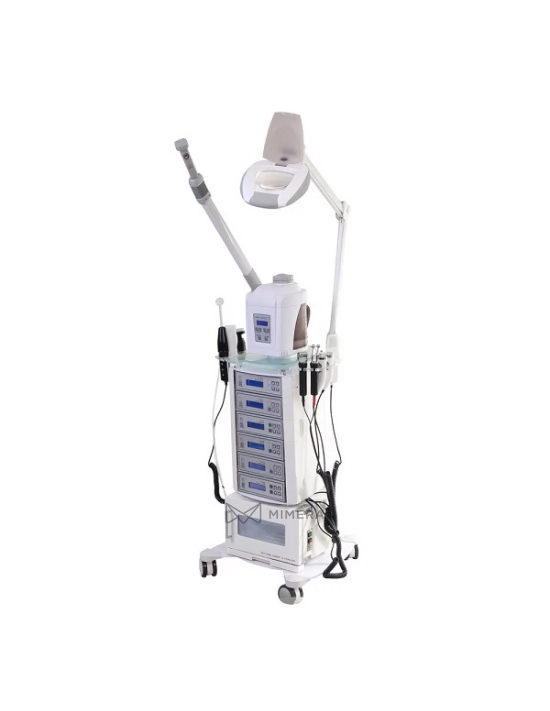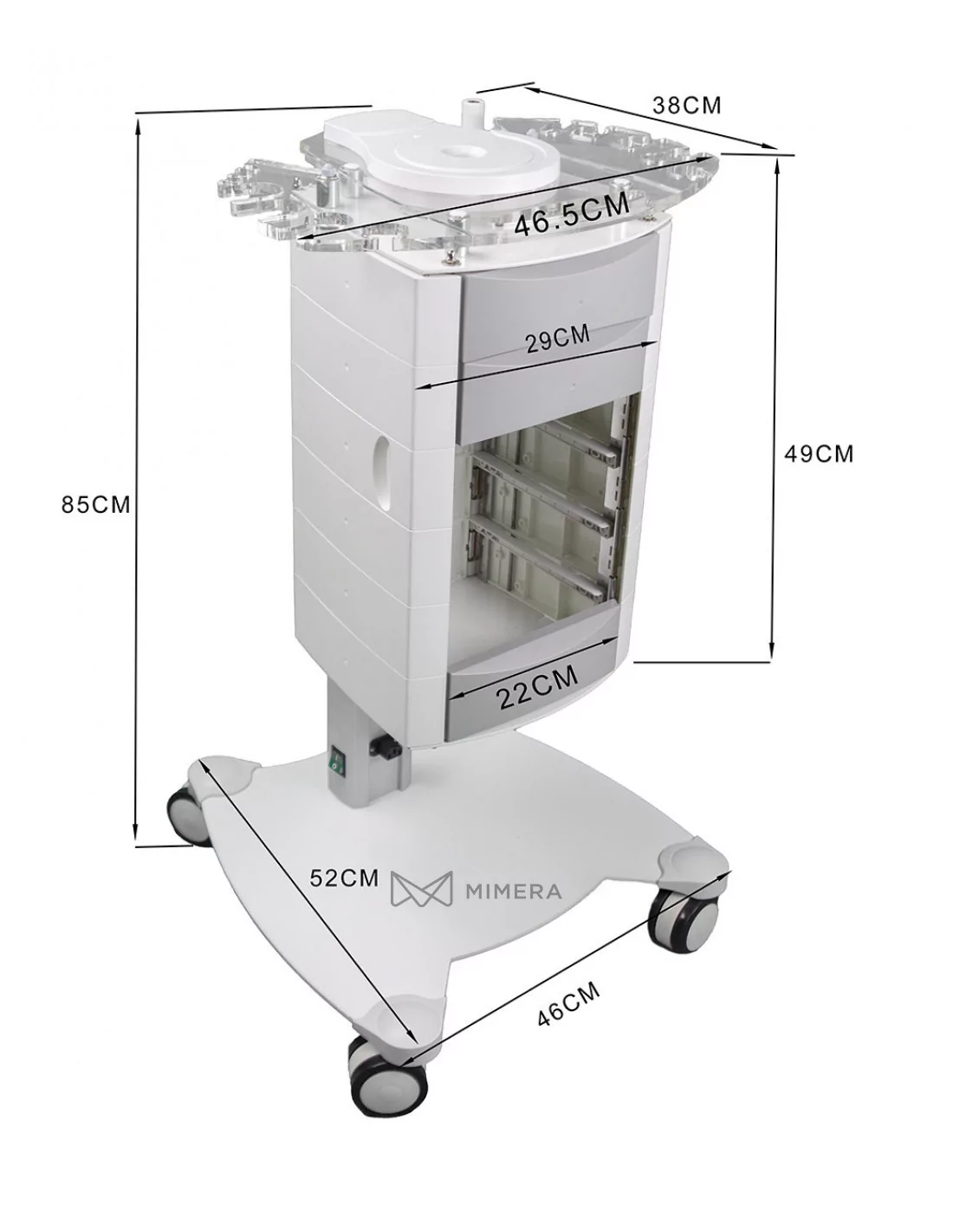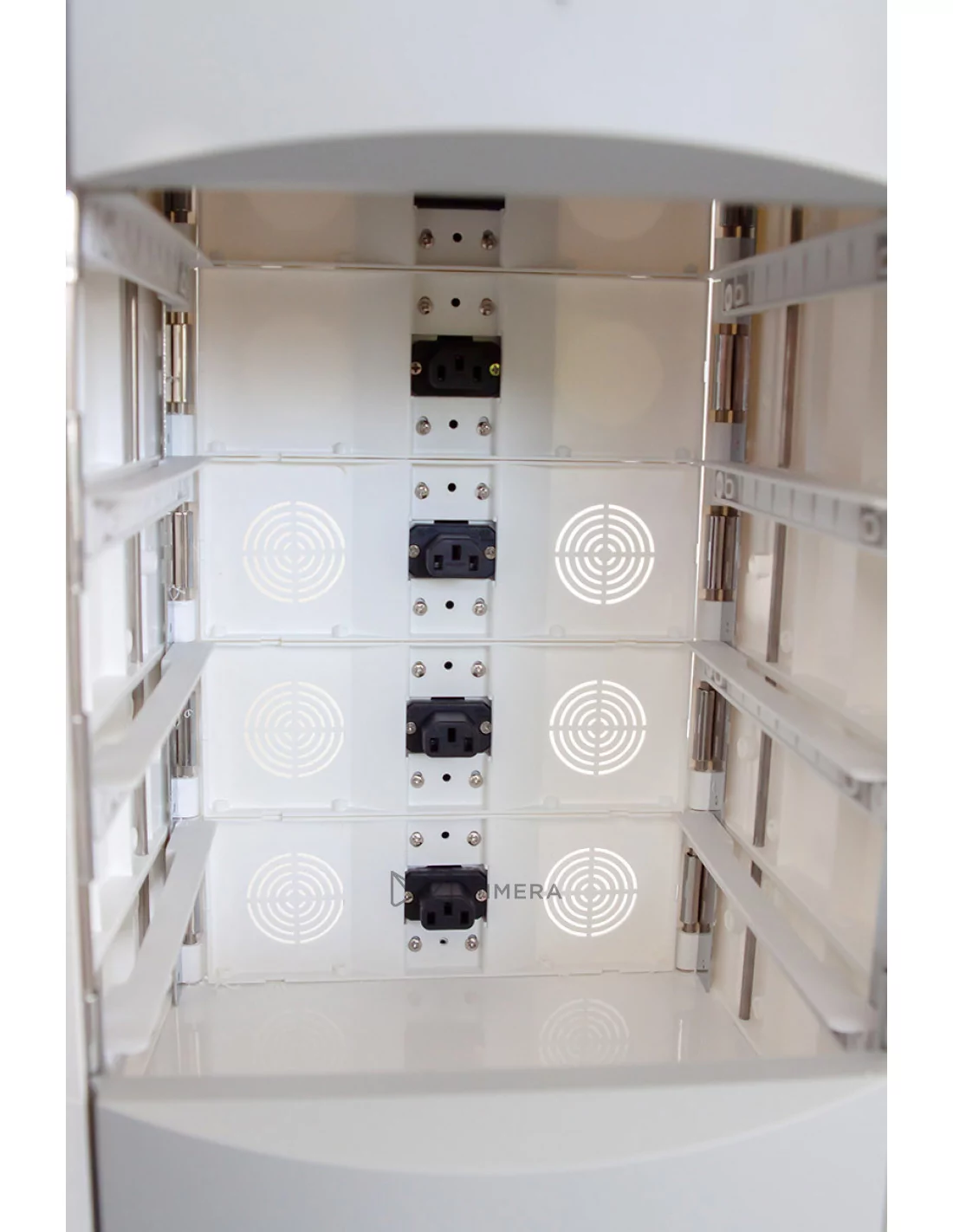 Na hornú časť kozmetického stojana je možné upevniť digitálny naparovač WITTY a v spodnej časti stojana je možné priamo do zásuvky napojiť 7 L ohrievač uterákov. Kozmetickú lampu s lupou, ktorá sa dá taktiež upevniť na hornú časť stojana, si možete vybrať z našej ponuky. Stojan má šesť odnímateľných otvorov so zástrčkami pre kozmetické prístroje, takže stojan môžete prispôsobiť svojim potrebám. V našej ponuke nájdete sériu 9 kozmetických prístrojov.